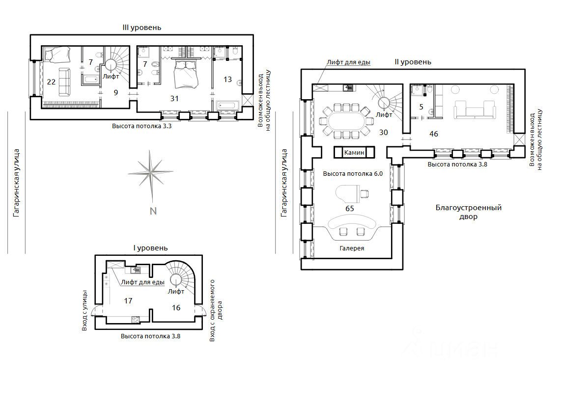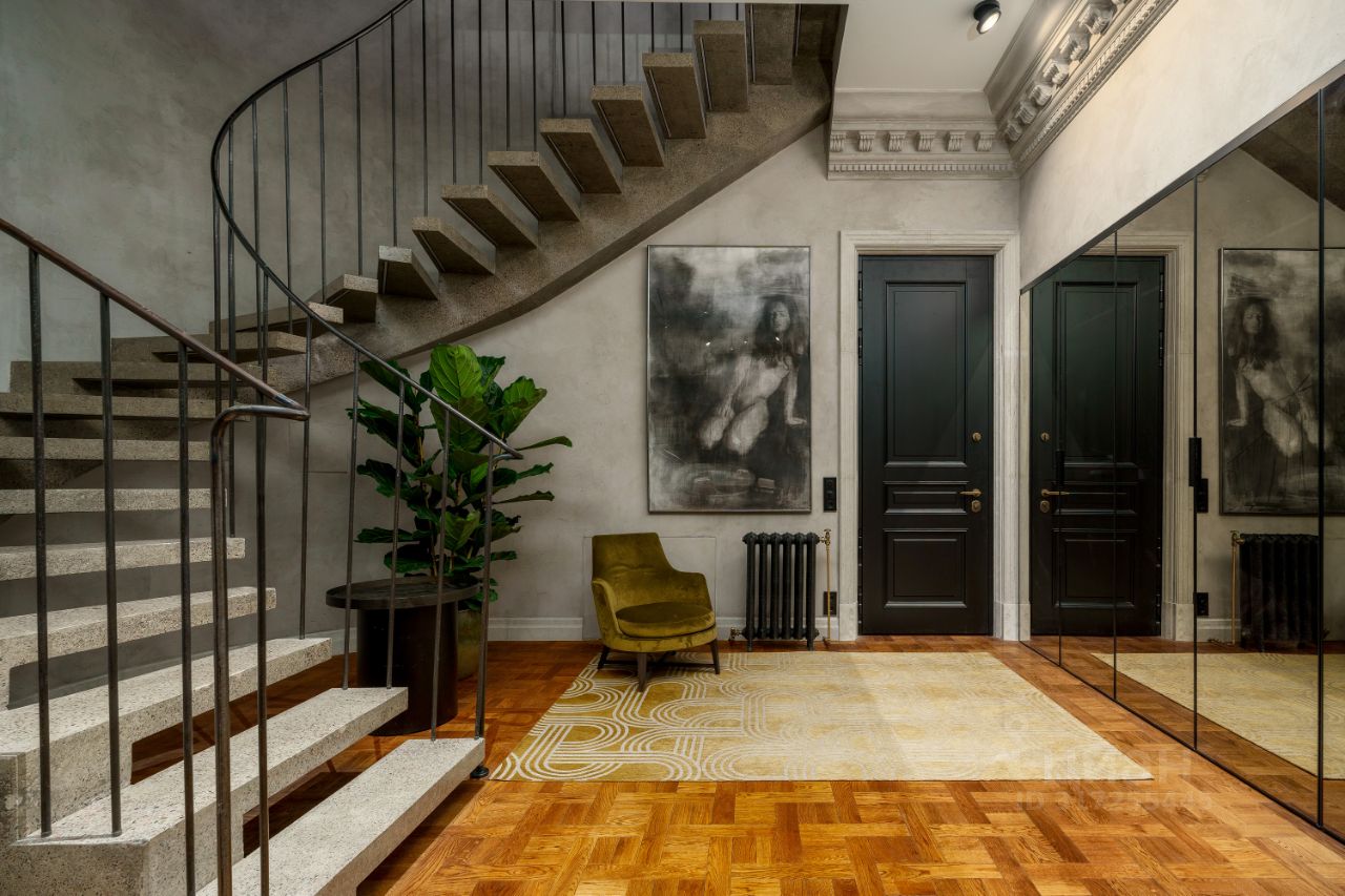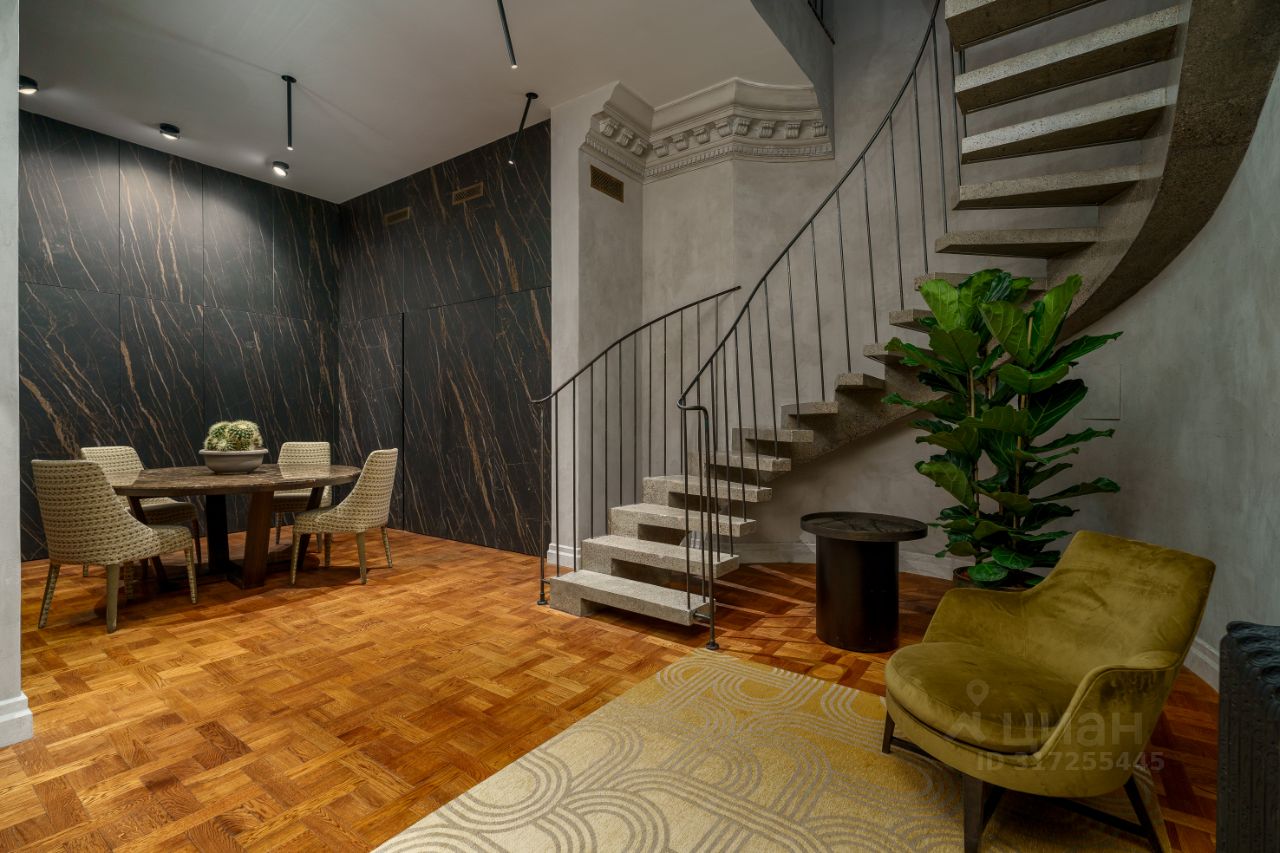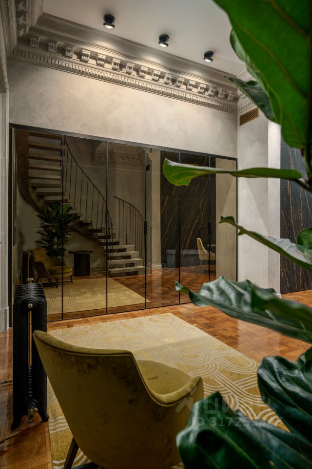 Первый этаж занимает просторный холл и стильная кухня, а также лифт, который доставит блюда на второй этаж. Пространство трех этажей соединяет изящная винтовая лестница, которая является самостоятельным арт-объектом. По желанию нового владельца можно будет установить лифт. Поднимаясь на второй этаж Вы попадаете в парадную гостиную 65 метров с 6-метровыми потолками, огромными окнами и камином. Это пространство впечатляет своим объемом и не оставит Вас равнодушным! Также на втором этаже расположилась столовая и вторая гостиная. Третий этаж — полностью приватная часть. Здесь расположены две спальни.