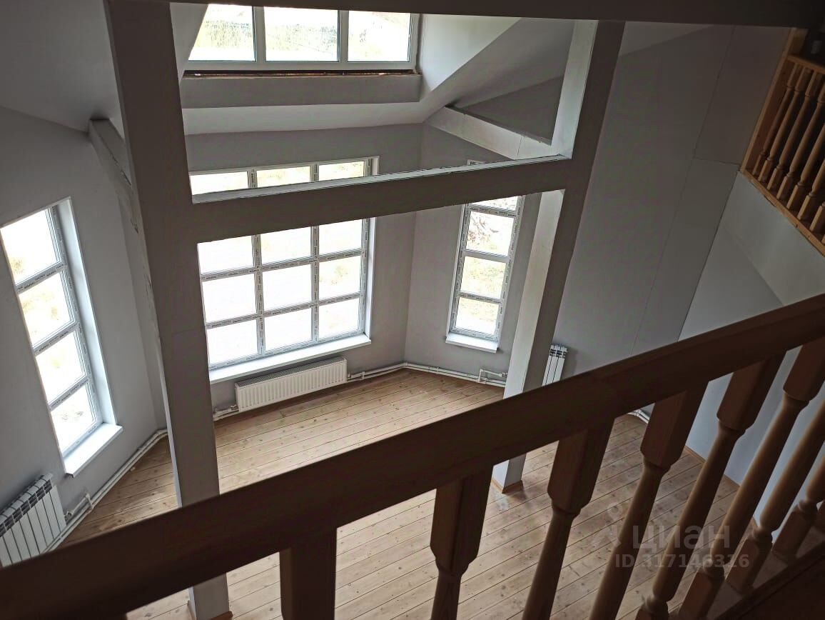 В доме красивый холл в два этажа с панорамными и световыми окнами, просторная кухня, 7 комнат, 4 санузла ( по два на каждом этаже).