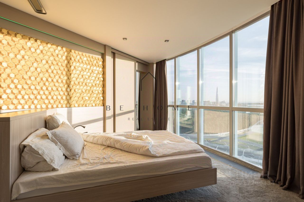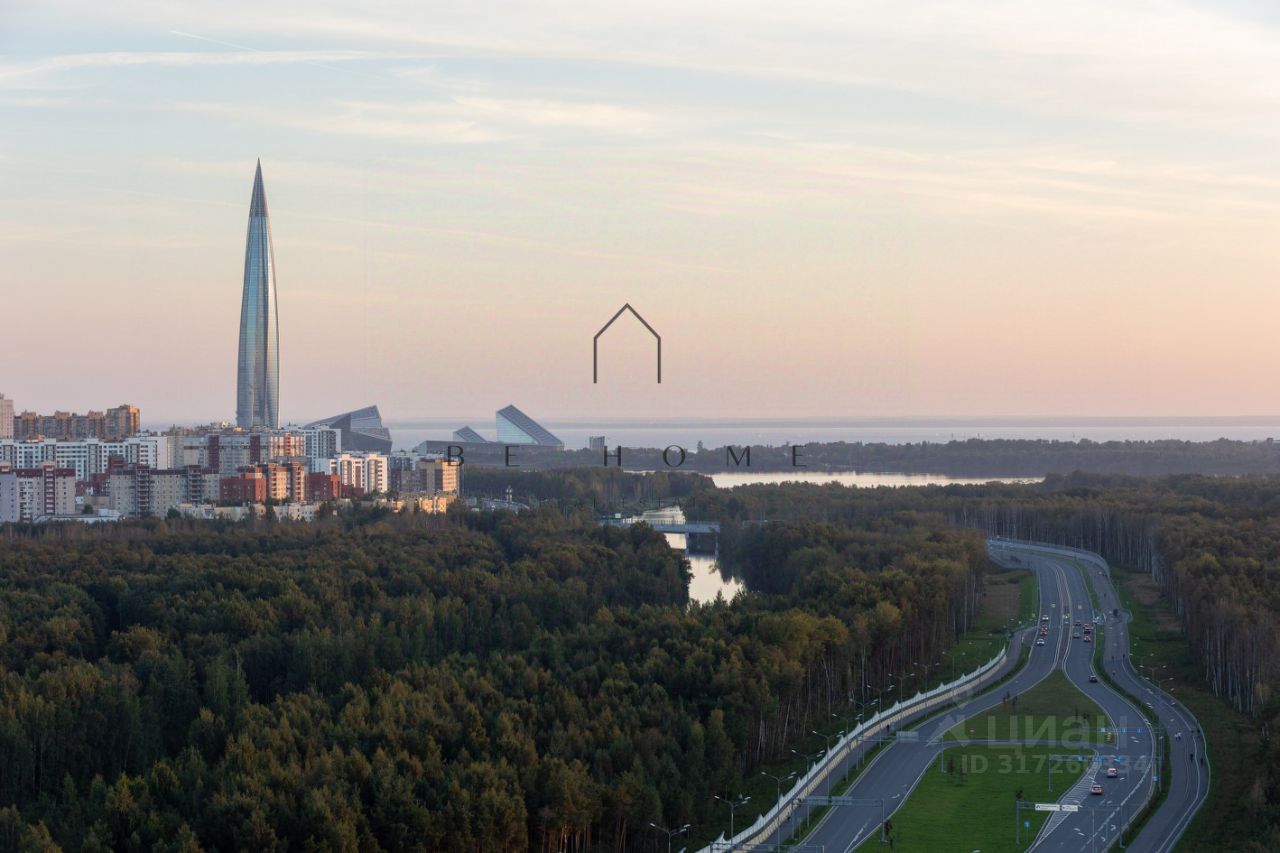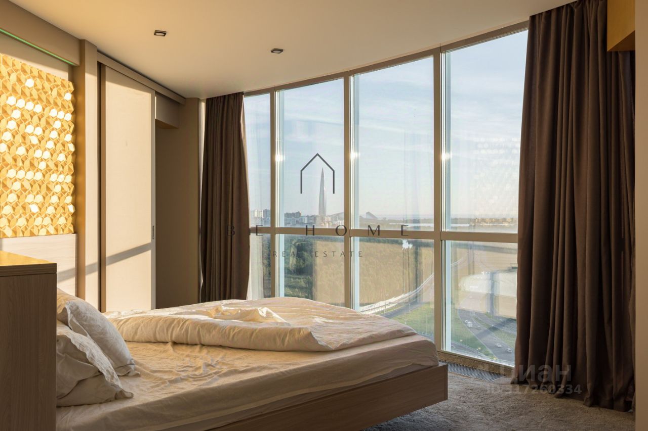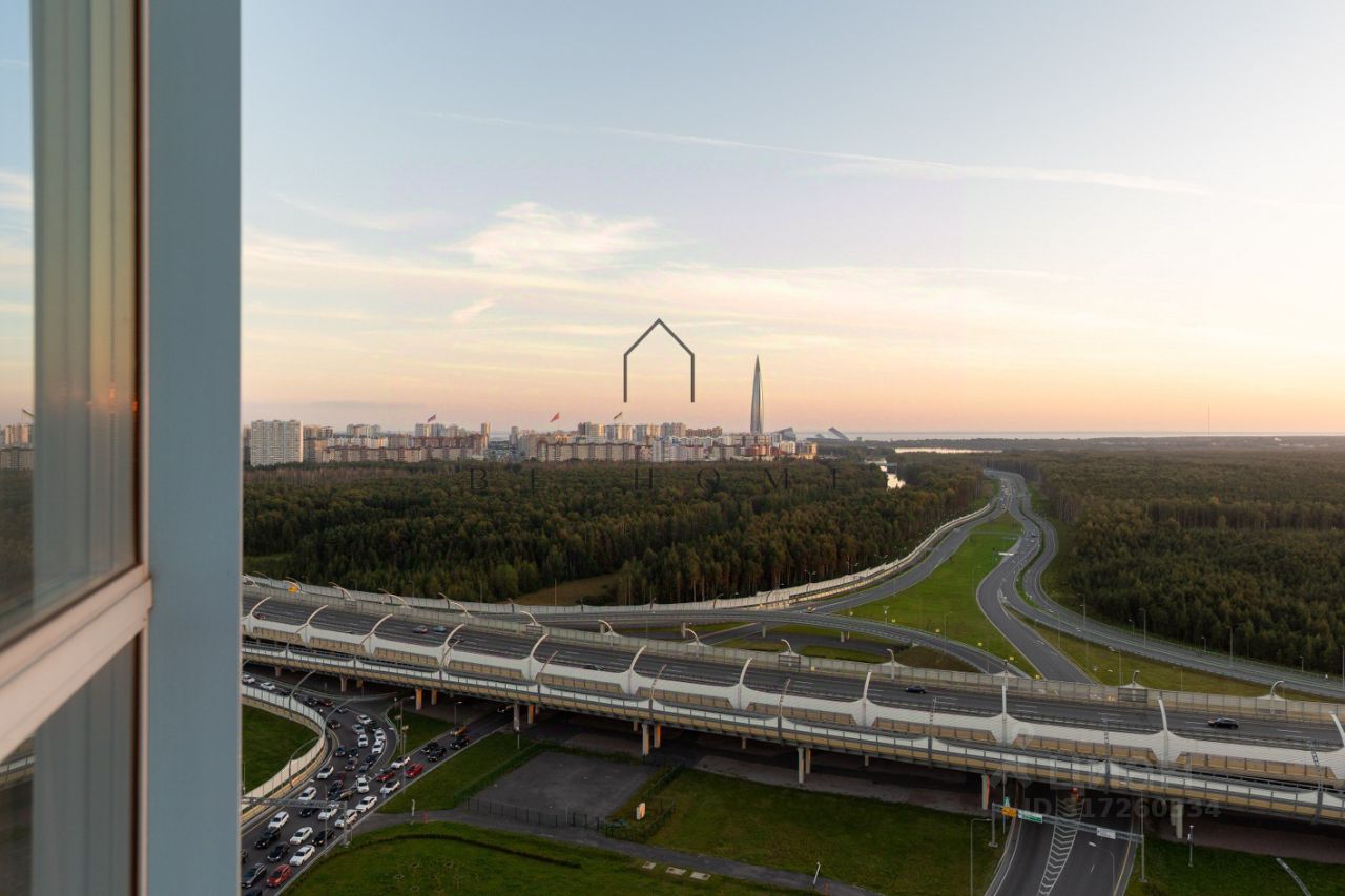 Квартира расположена на 22-м этаже и занимает 1/3 часть башни дома, где находятся лучшие квартиры в данном комплексе. Из панорамных окон открывается захватывающий вид на город с углом обзора в 180 градусов. Финский залив, Лахта-центр, развязка ЗСД, Юнтоловский заказник -- самые красивые природные и архитектурные объекты современного Петербурга как на ладони в любое время суток. Окна кухни выходят на северо-восток, комнат на юго-запад.