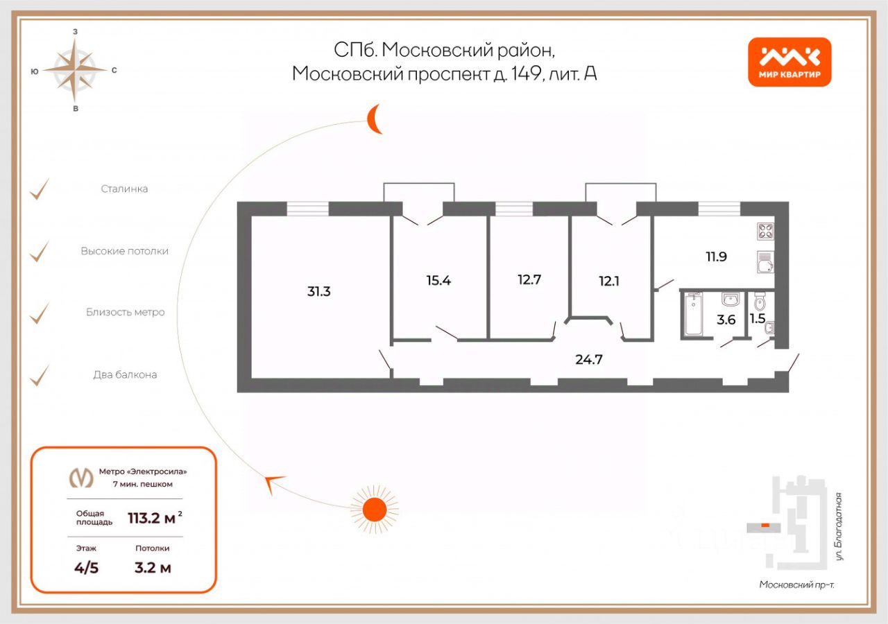 Арт. 103919798 В продаже отличная семейная квартира на одном из главных проспектов Петербурга - на Московском.