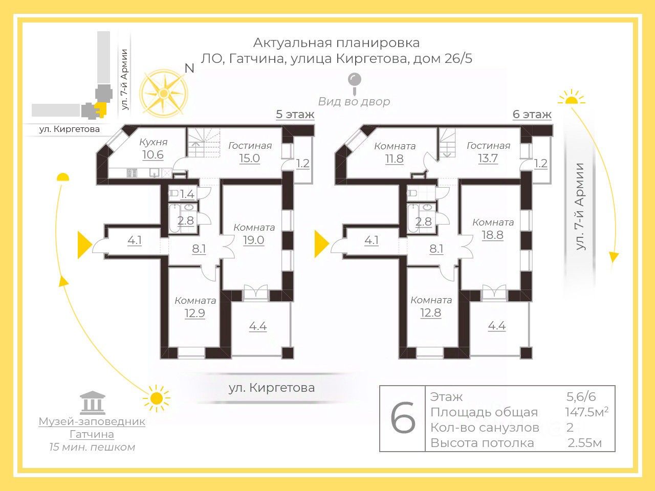 Общая площадь 147,5 кв.м+4 лоджии (1,2+4,4 (5 эт)+1,2 +4,4 (6 эт)) м2 Квартира на 5-6 этажах, вход в квартиру возможен в настоящее время с каждого этажа, но при желании можно оставить один вход. Все площади помещений в прикрепленной таблице.