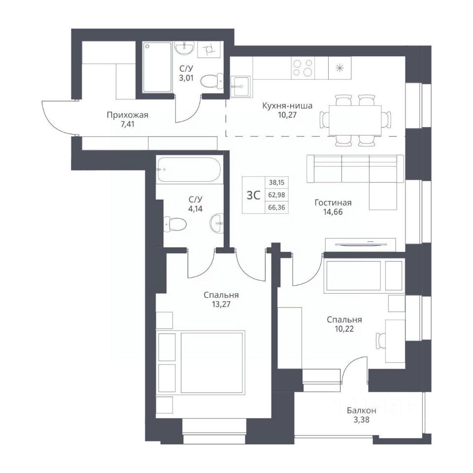 Общая площадь66,36 м2