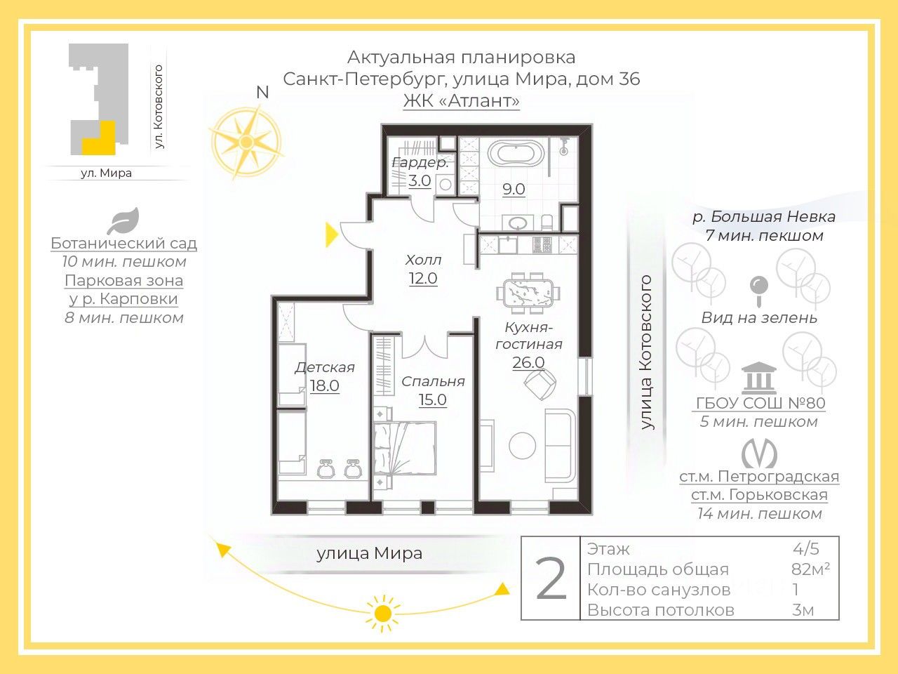 Локация предусматривает сочетание развитой инфраструктуры и большого количества зеленых зон. Всего в 8 минутах ходьбы прекрасная благоустроенная прогулочная зона у реки Карповки, набережная реки Невы и Ботанический сад. В 500 метрах Каменоостровский проспект и потрясающая по красоте архитектуры Австрийская площадь. Станции метро Горьковская и Петроградская в пешей доступности. Вокруг множество школ, детский садов и престижных учебных заведений. В вашем распоряжении лучшие кафе, рестораны, магазины и развлекательные заведения. В непосредственной близости новые точки притяжения города гастромаркет Балаган и флагманский кинотеатр Мираж. Быстрый выезд в соседние районы города за счет близости к набережным.