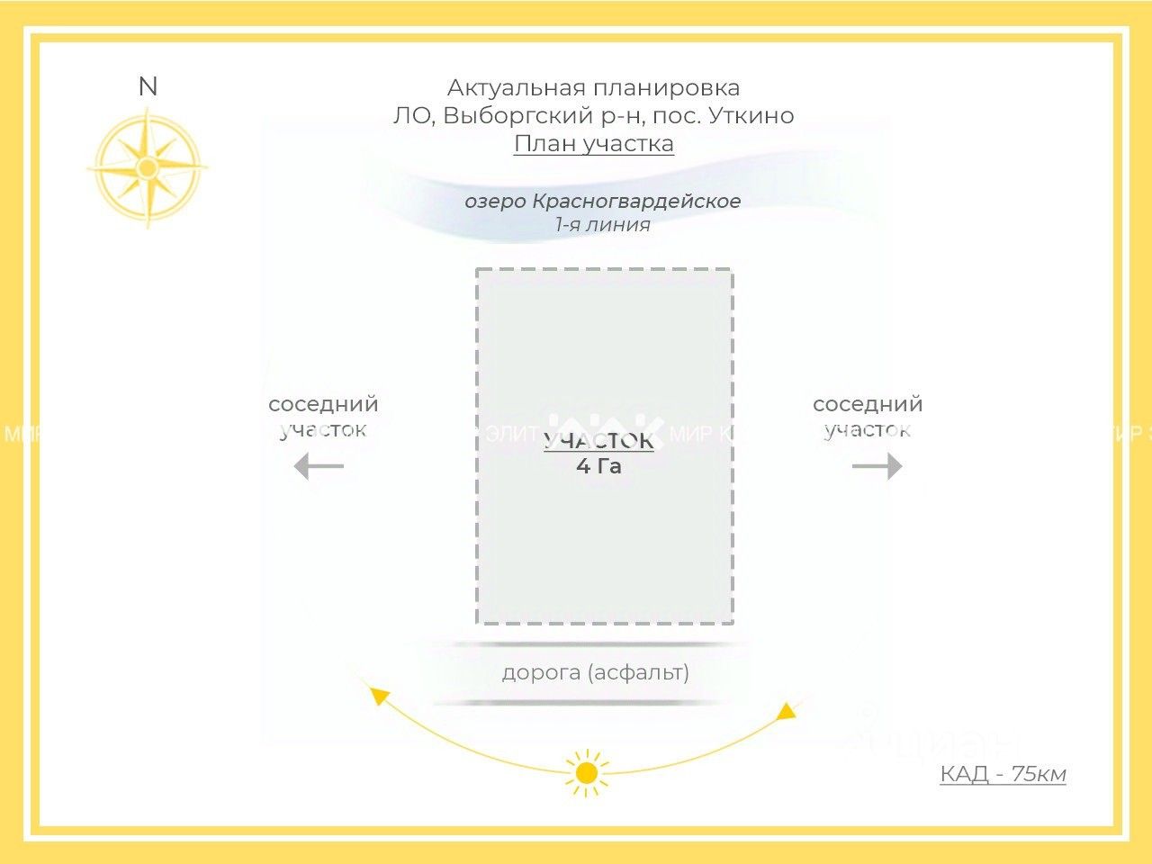 Арт. 104160751 Продам четыре гектара у Красногвардейского озера. Участок ИЖС 400 соток, находится в поселке Уткино. Отличные дороги. Приветливые соседи. 75 км от КАД. Электричество 50 кВт. Подходит для строительства коттеджного посёлка и т.п.