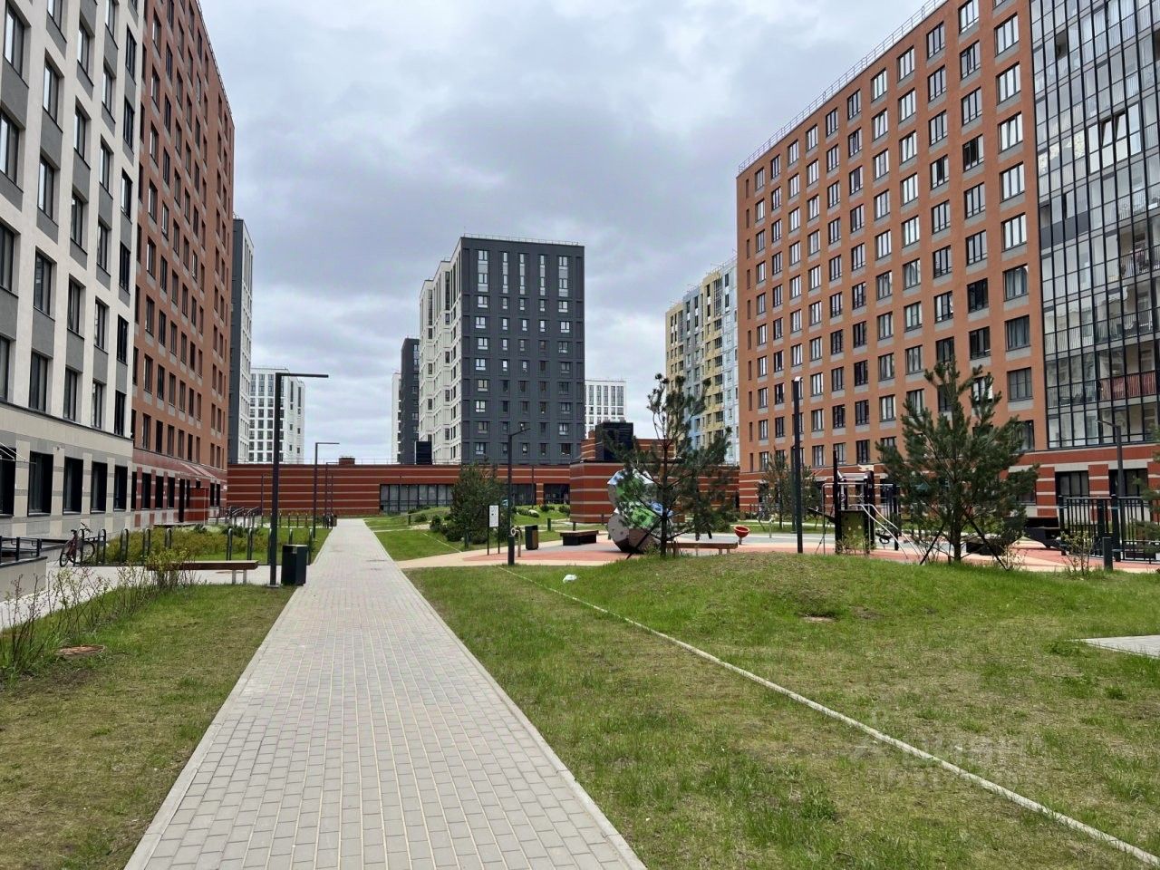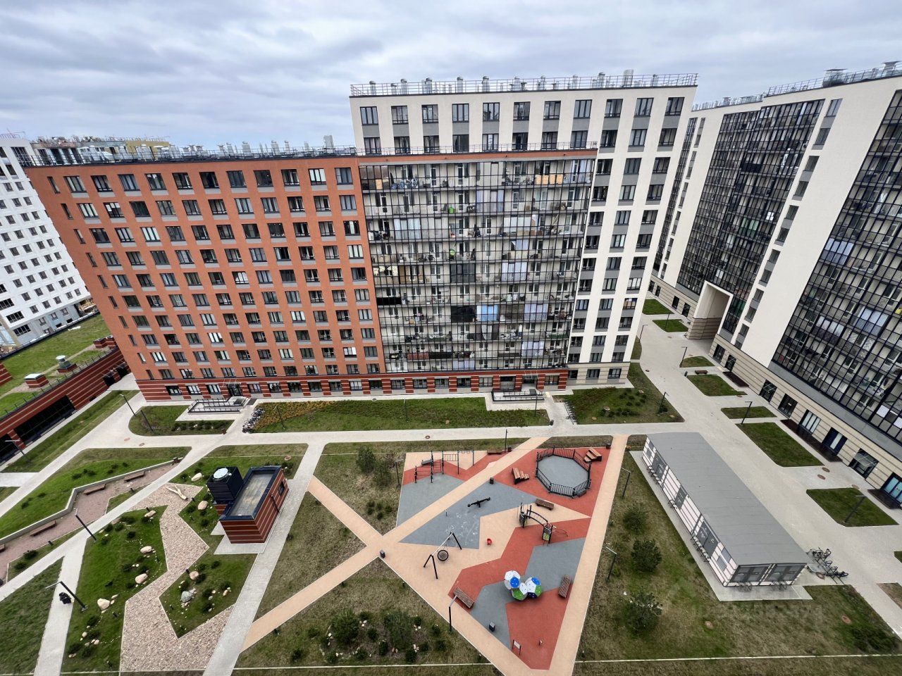 Закрытая охраняемая территория с детскими площадками,прогулочными зонами,ландшафтом и озеленением.