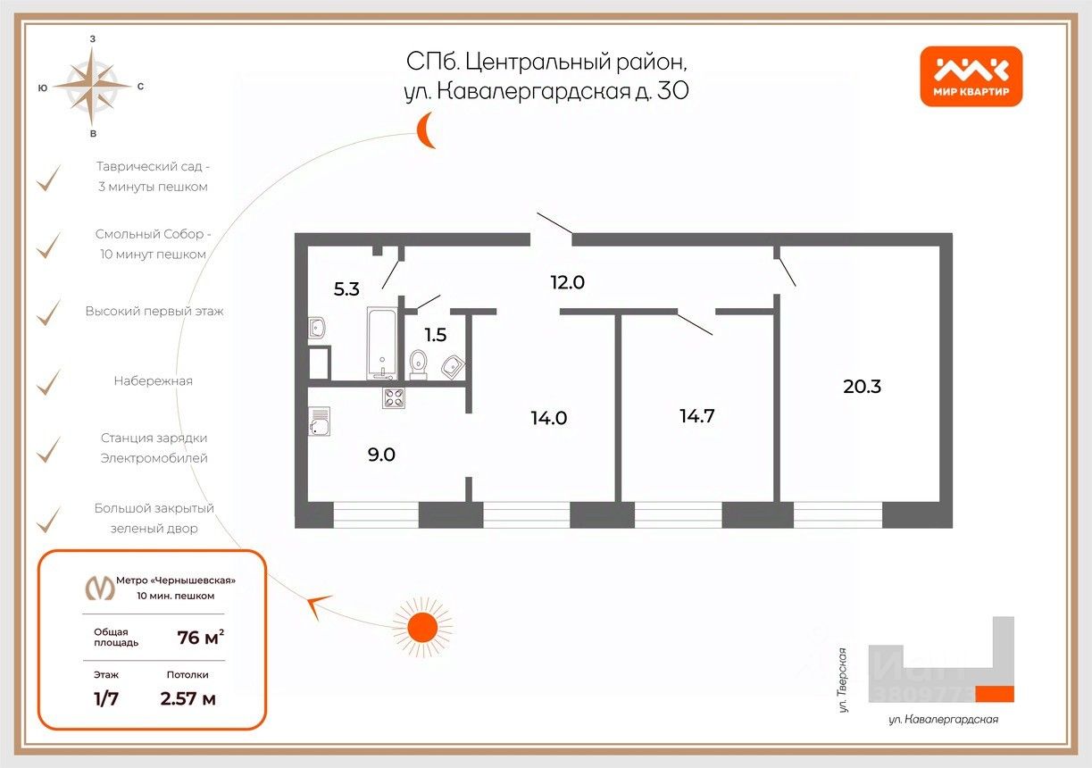 Дом кирпичный, построен в 1962 году по индивидуальному проекту. Кирпичные стены обеспечивают тепло и тишину. Большой ухоженный закрытый двор с густо растущими деревьями, площадкой и паркингом со станцией зарядки электромобилей. Чистая парадная, приличные соседи, полная безопасность. Первый высокий этаж! Вы не увидите мимо прогуливающихся прохожих. Квартиру легко адаптировать под свои вкусовые предпочтения. Выполнен базовый ремонт. Площадь квартиры составляет 76 квадратных метров. Три светлые изолированные комнаты и уютная кухня правильной формы.