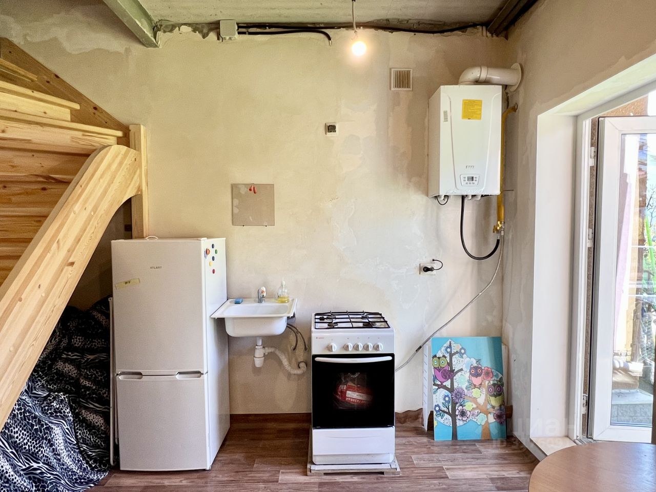 - На первом этаже кухня и ванная комната, выход на собственный уголок природы. - На втором этаже, куда ведет устойчивая деревянная лестница — уютная комната, готовая к проживанию с выходом на балкон. А с балкона открывается вид на собственный участок и небо. Высота потолка 3 метра.