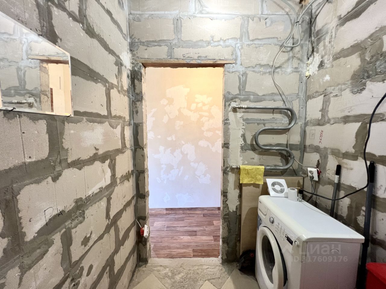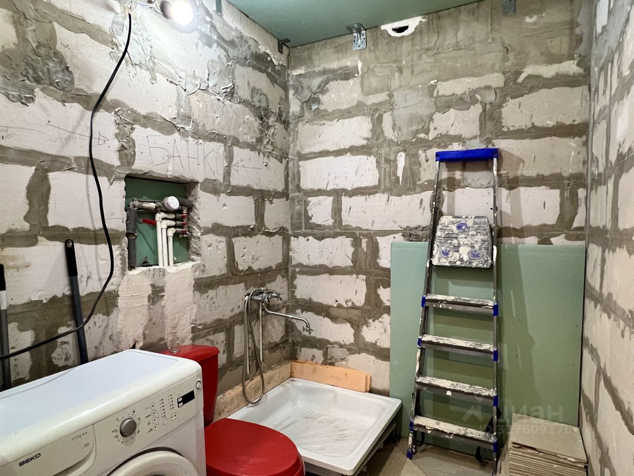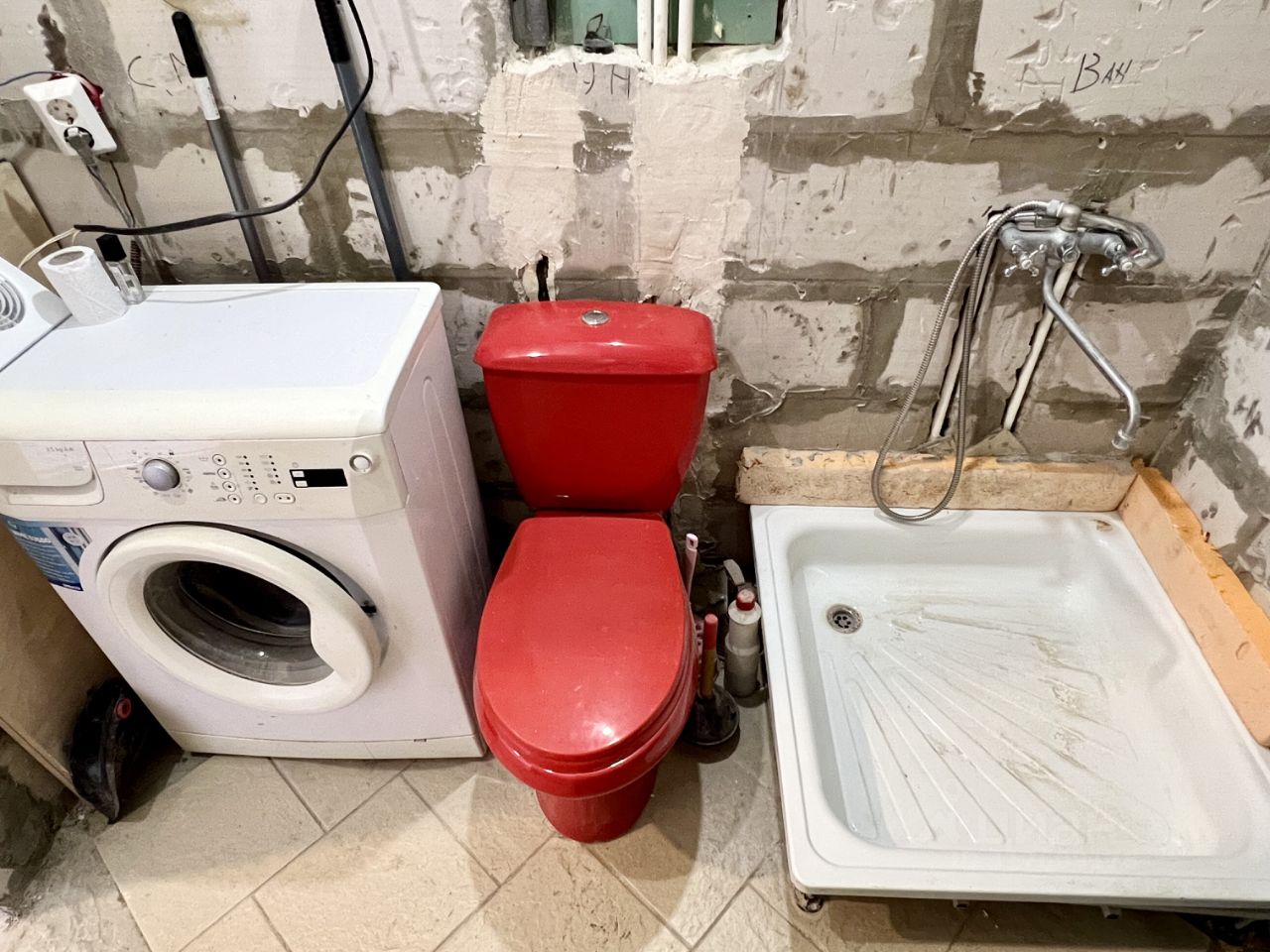 Состояние ванной позволяет воплотить дизайн Вашей мечты. Душ — временный, но функционирующий. Стиральная машина остаётся — стирает, не капризничает.