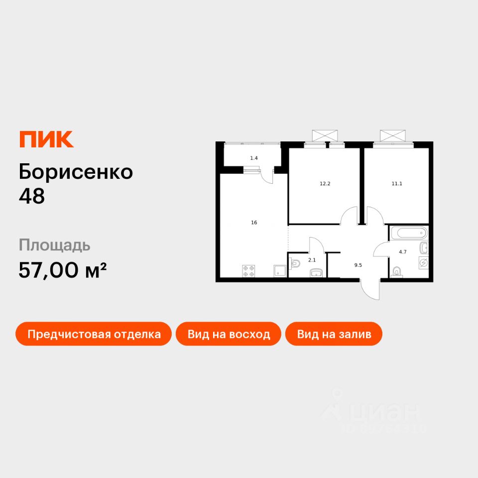 Продаётся 2-комн. квартира площадью 57 кв.м на 19 этаже 28 этажного дома (Корпус 2, Секция 2) проекта ПИК Борисенко 48. Светлый просторный подъезд на уровне земли, функциональная планировка, большие окна, предчистовая отделка.
