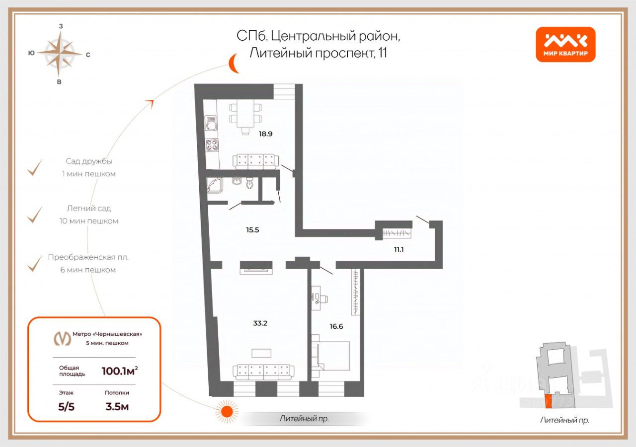 В пешей доступности множество знаковых мест нашего города: Сад дружбы, набережная Невы, Преображенский собор, Михайловский замок и Марсово поле, музей Бродского в доме Мурузи, театры на Литейном и на Моховой, Большой театр кукол.