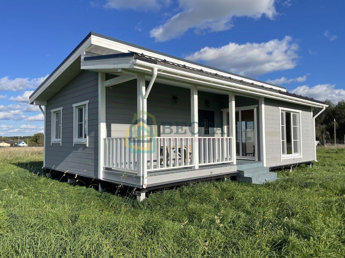 + каркасный, утепление стен 200 мм + внешняя отделка - имитация бруса + внутренняя отделка имитация бруса + две спальни и просторная кухня-гостиная с окнами в пол + совмещенный санузел, бойлер + отопление за счет теплых полов и электроконвекторов + фундамент - железобетонные сваи + потолки 3.