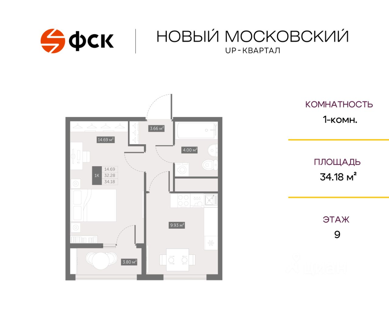 Цена со скидкой до 30% в прямой продаже от застройщика — только в этом месяце. Беспроцентная рассрочка. 1-к квартира в ЖК Up-квартал ''Новый Московский'' на 9-м этаже. Общая площадь 34,18. Без отделки.