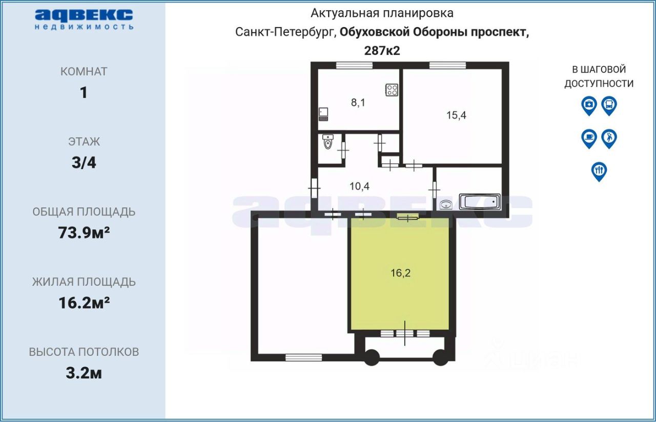 ID: 1787663 Продаётся просторная комната (16,2кв.м) в 3-х комнатной квартире, в кирпичном доме сталинской постройки. В комнате имеется балкон, застекленный. При желании его можно утеплить, увеличив тем самым полезную площадь на 3 кВ.м. Квартира теплая, высокие потолки (3,20м). Также продается вторая комната (15.4 кв.м) Дом расположен в замечательном парке, который был недавно отреставрирован, проложены пешеходные тропинки, установлены детские аттракционы, декоративные лавочки. Район с развитой инфраструктурой, в пешей доступности отделение банка, продуктовые магазины, аптеки, школа, детский сад. Удобная транспортная доступность, есть множество парковочных мест вокруг дома. Остановки общественного транспорта - в 3-х минутах пешком.