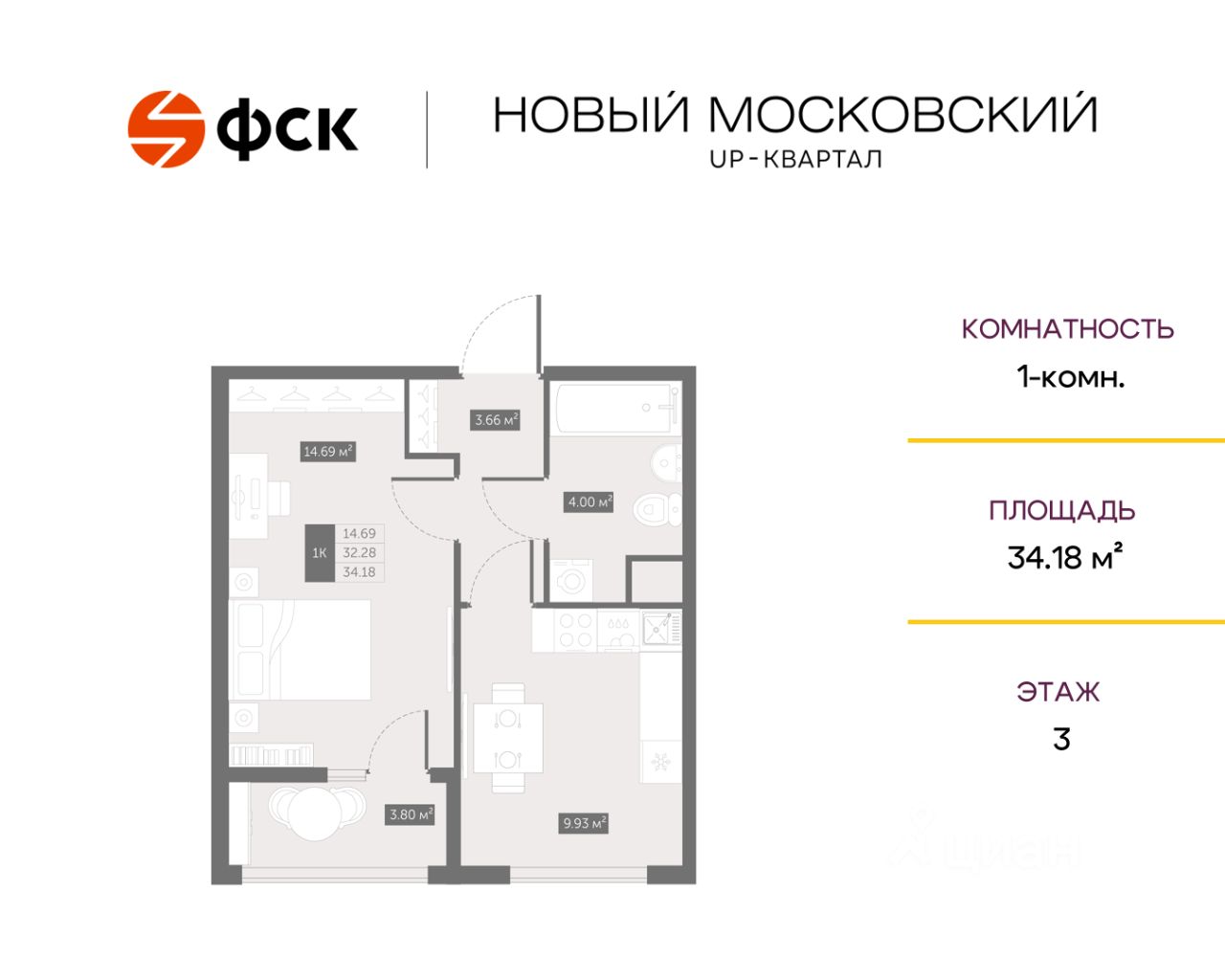 Цена со скидкой до 30% в прямой продаже от застройщика — только в этом месяце. Беспроцентная рассрочка. 1-к квартира в ЖК Up-квартал ''Новый Московский'' на 3-м этаже. Общая площадь 34,18. Без отделки.