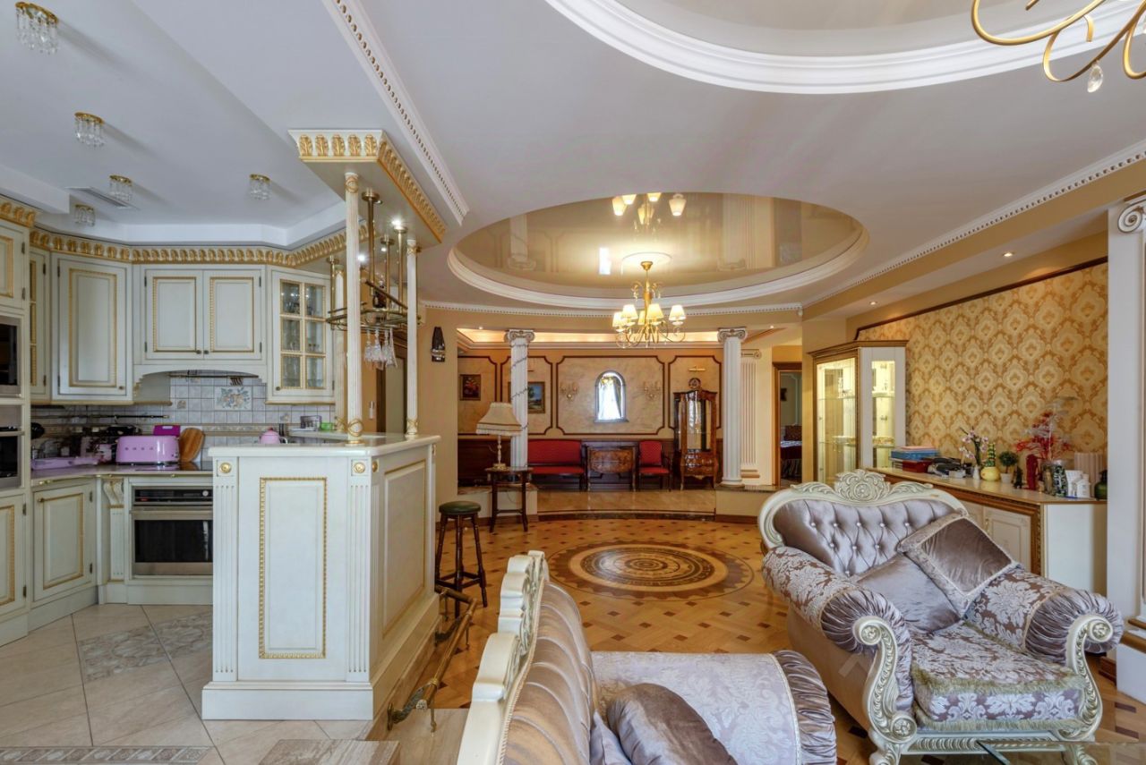 Кухня премиум-класса Francesco Molon, совмещена с гостиной. Фасады шкафов в полную высоту стен, со встроенной техникой: варочная панель, духовой шкаф, СВЧ, кофе машина, холодильник от Kppersbsuch. Барная стойка со столешницей из натурального мрамора, Италия. Гостиная сердце квартиры, обустроена дорогой итальянской мебелью Minnotti. ''Теплые'', натуральные фактуры дерева, текстиля, а также картины на стенах, создают обволакивающую ауру уюта.