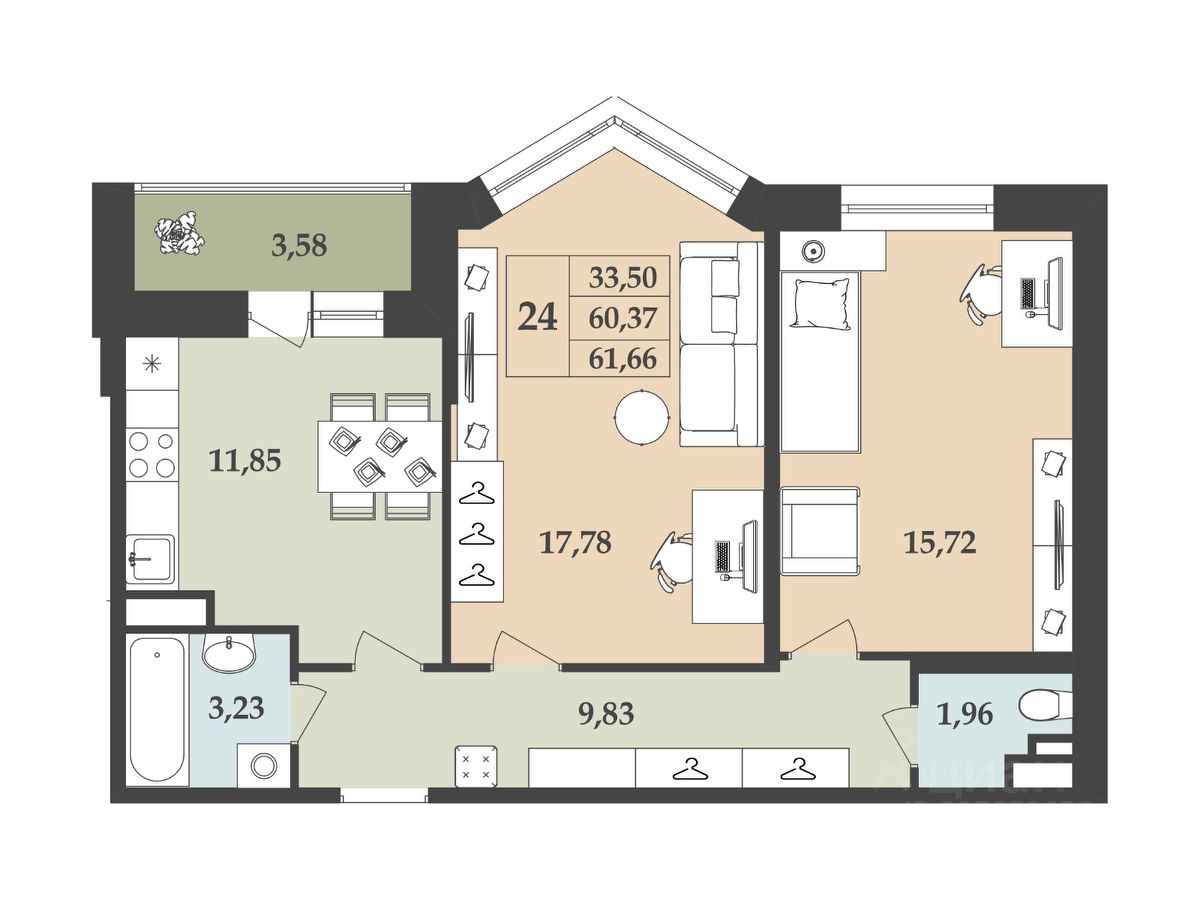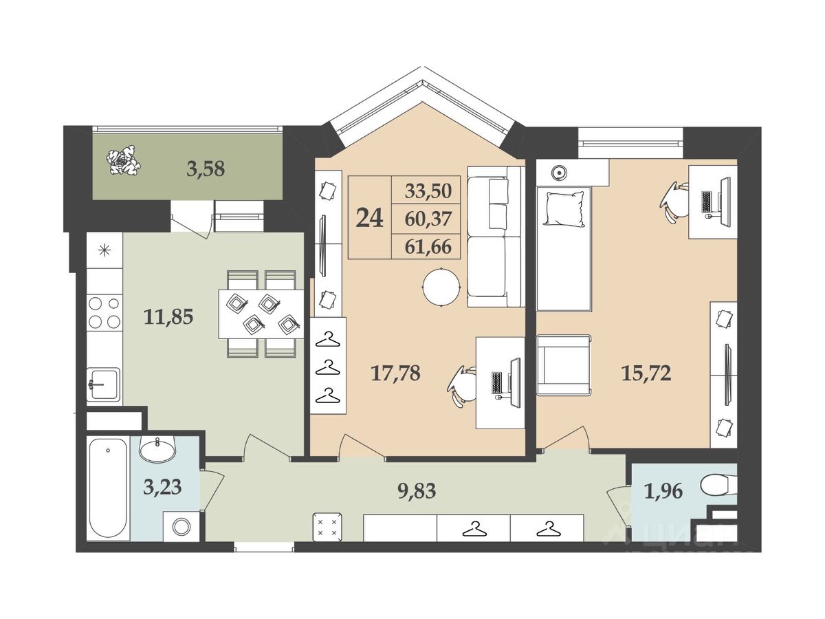 Действительно КОМФОРТНАЯ планировка с ПРОСТОРНЫМИ ИЗОЛИРОВАННЫМИ комнатами. БОЛЬШАЯ кухня. Много свободного пространства для установки различных систем хранения.