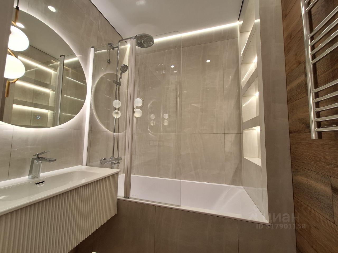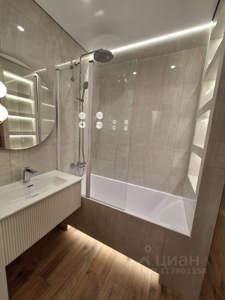 Ванна из литьевого мрамора. Санузел раздельный, оборудован стиральной машиной и системой хранения.