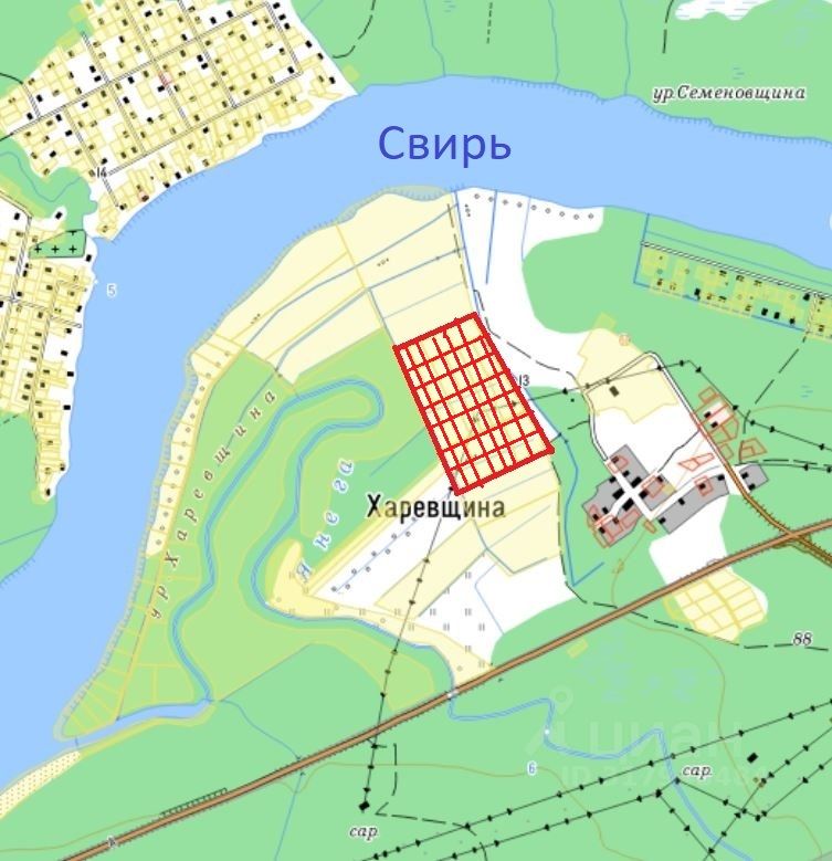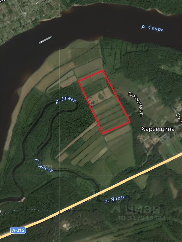 Берег реки Свирь. 50 участков каждый площадью от 22 до 25 соток, в сумме 12,5 гектар. Проведено межевание, у каждого участка свой кадастровый номер, дороги между участками отдельный кадастровый номер. До реки 300 метров, между участками и рекой водоохранная зона, там ничего строить нельзя, останется свободное место. До участков идет асфальтовая дорога. Участки граничат с деревней Харевщина, в деревне электричество, водопровод от Водоканала и газ. Делался запрос в Ленэнерго, стоимость подключения 145 т.р на один участок 15 КВт. Подготовка под дороги между участками, снят слой земли. Очень красивое место, река, сосновый лес. Стоимость за все участки. В деревне один магазин, до города Лодейное Поле 6 км.