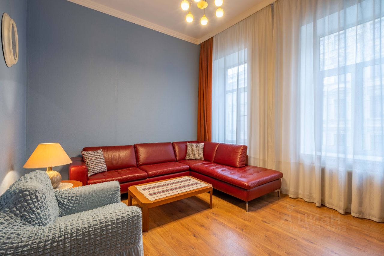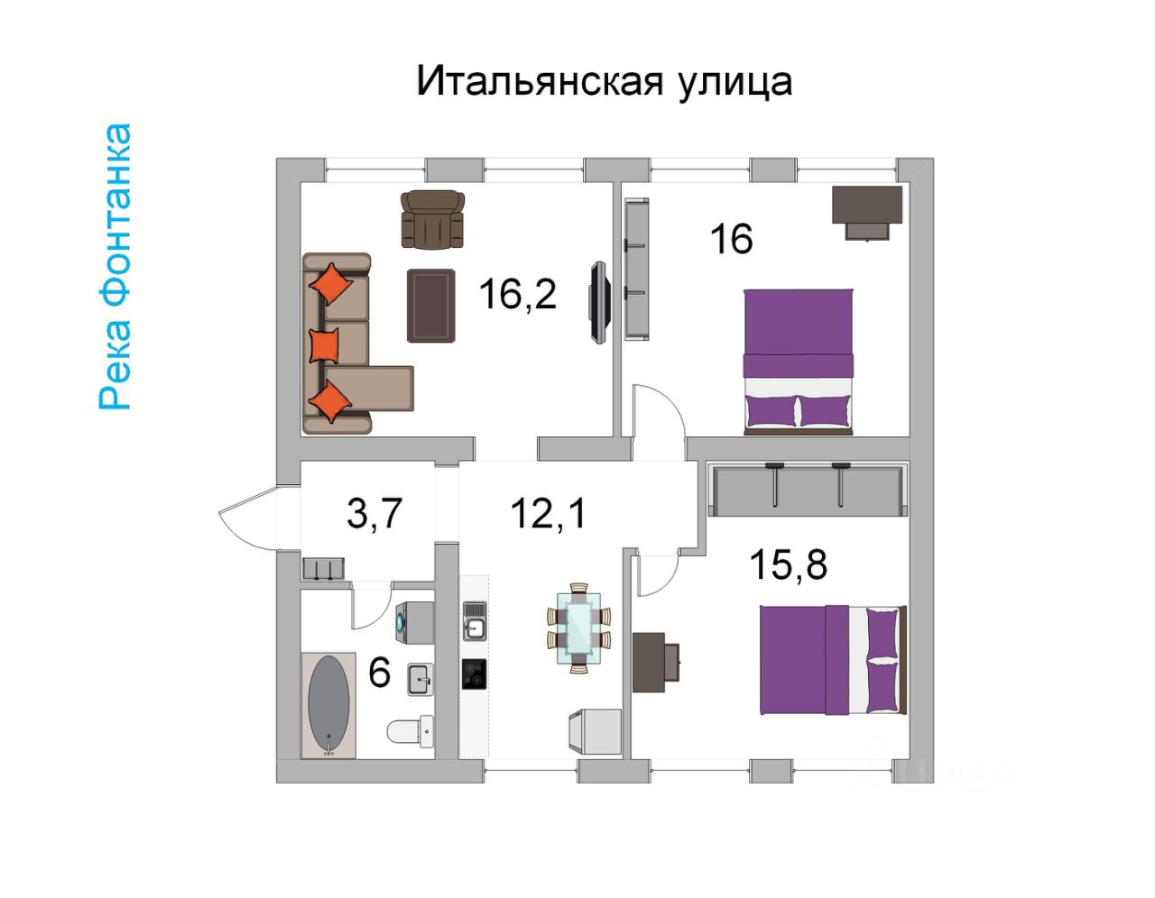 Предлагается к аренде трехкомнатная квартира на втором этаже пятиэтажного дома в Золотом треугольнике Санкт-Петербурга. Вход с закрытого благоустроенного двора. Однородный социум. Окна кабинета и гостиной выходят на Итальянскую улицу. Окна кухни и спальни выходят в тихий двор. Площадь комнат 16+15,8+16,2 м2. Площадь кухни 12,1 м2. Высота потолков - 3,6 метра. Квартира сдается с мебелью и бытовой техникой: холодильник, посудомоечная машина, утюг, микроволновая печь. Развитая инфраструктура района: в шаговой доступности магазины, рестораны, аптеки, кафе. Парковка на улице свободная. Требования к арендодателям: без животных. ----- Примечание: у собственника могут быть дополнительные пожелания к жильцам - обсудите их в чате или по телефону