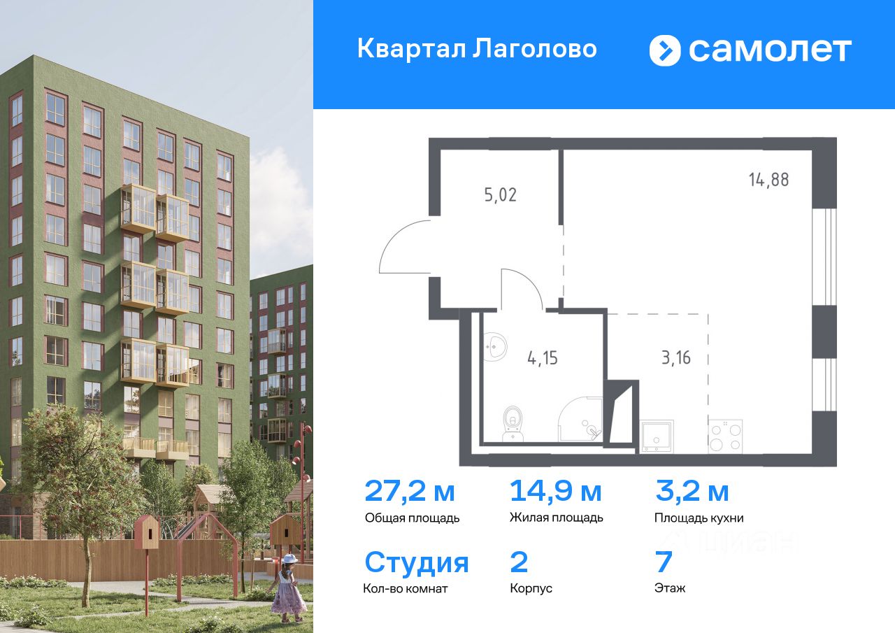 Предлагается квартира студия комфорт-класса 27,21 кв.м в корпусе 2 на 7 этаже, в ЖК ''Квартал Лаголово'' Квартира с чистовой отделкой. Доступность дополнительных опций уточняйте у застройщика.