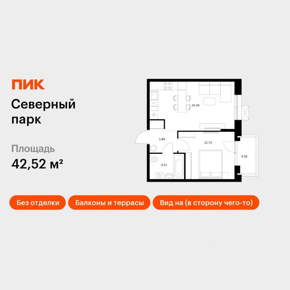 Продаётся 1-комн. квартира площадью 42,52 кв.м на 2 этаже 10 этажного дома (Корпус 12, Секция 1) проекта ПИК Северный парк. Светлый просторный подъезд на уровне земли, функциональная планировка, большие окна, без отделки.