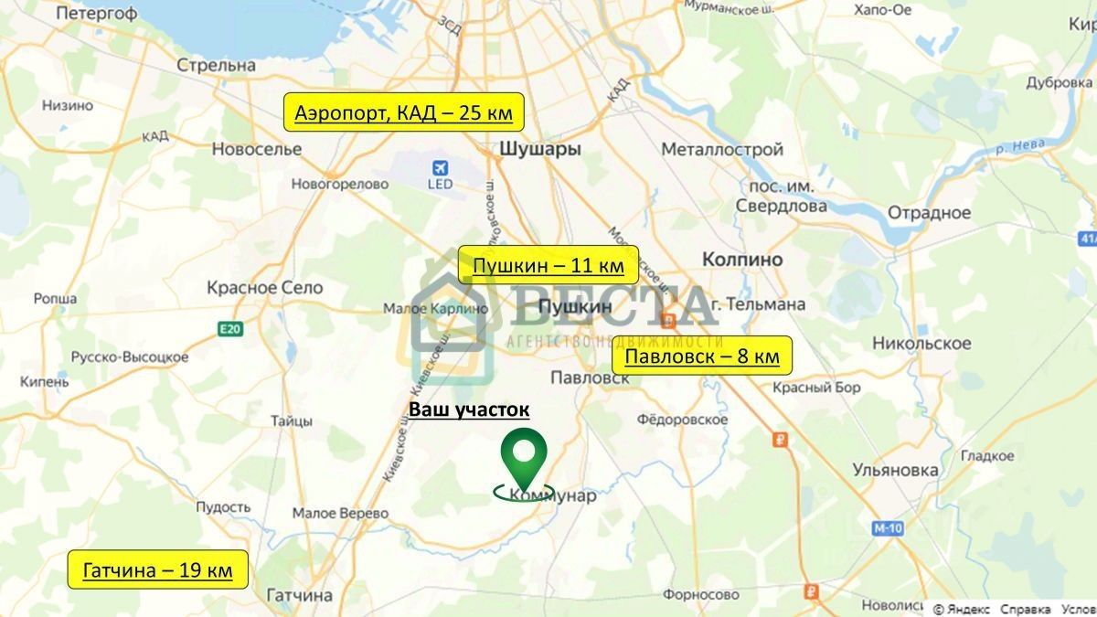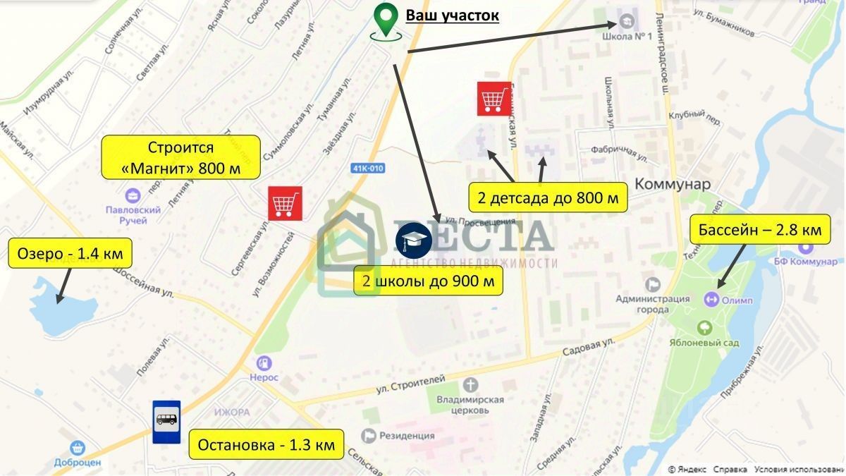 Инфраструктура: Всего 1 км находятся 2 детсада и 2 школы. Также рядом областной центр реабилитации, детская поликлиника, а также сетевые магазины, и вся необходимая инфраструктура г. Коммунар. Ближайший продуктовый магазин ''Магнит'' строится всего в 800 метрах. В 1,5 км - озеро для купания. 1,8 км до кафе, магазинов, спортивного комплекса. Всего в 10-15 минутах на автомобиле - исторические места, парки и дворцы г. Пушкина и г. Павловска.