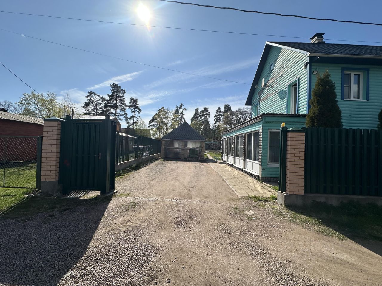 Участок огорожен забором с откатными воротами . Тротуарной плиткой выложено парковочное место на несколько машин .