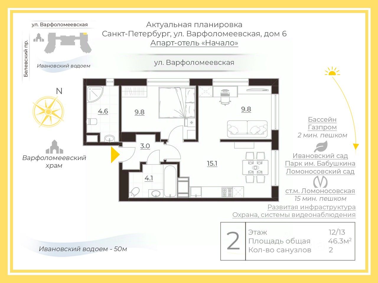 Двухкомнатный апартамент находится на высоком 12 этаже, площадь 46,3м2, высота потолков 2.8м. Украшением квартиры являются большие окна с панорамным остеклением и с/у с просторным видом.