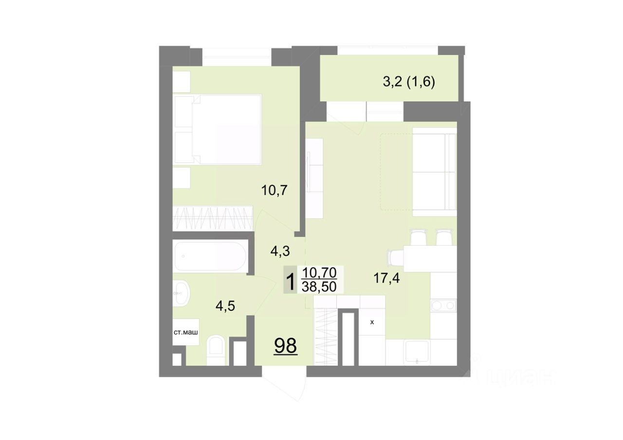 Общая площадь38,5 м2