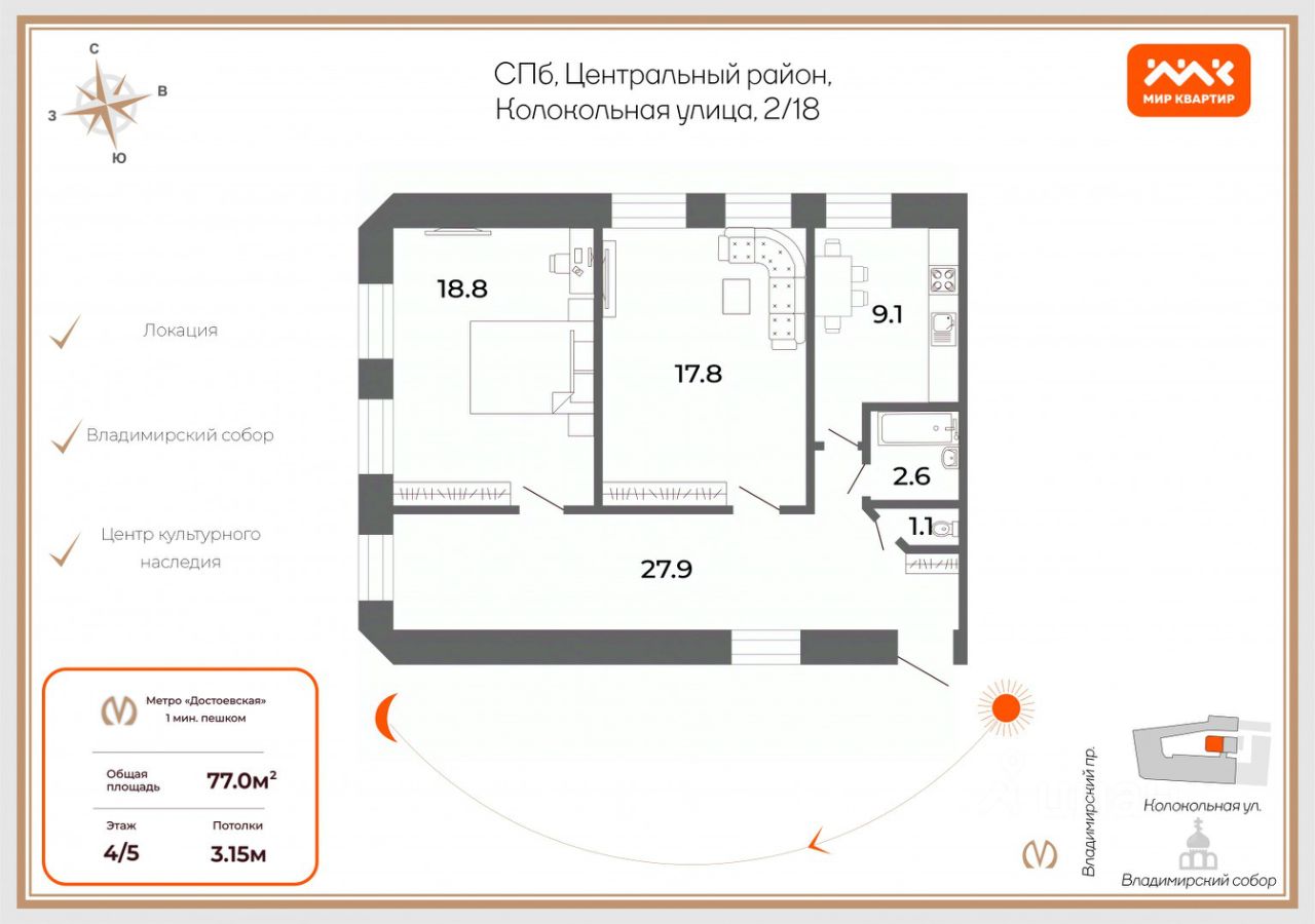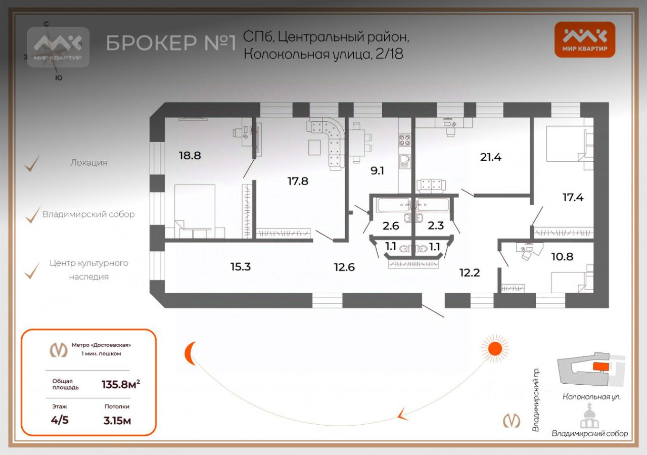 Расположенная в редкой и престижной локации напротив Владимирского собора по адресу ул. Колокольная, 2, эта светлая квартира с высокими потолками 3,15 м станет идеальным выбором для тех, кто ценит комфорт, стиль и историческую атмосферу. Парадный вход подчеркивает статусность дома, а продуманная планировка и аутентичность создают ощущение уюта и простора. Просыпаться под перезвон колоколов, выходить на прогулку мимо старинных особняков, заглядывать в уютные кофейни по пути в театр здесь каждый день наполнен особой атмосферой города. Квартира находится в окружении главных достопримечательностей города рядом театры, музеи, живописные парки, а также кафе, рестораны и бутики. Удобная транспортная развязка позволяет быстро добраться в любую точку Петербурга, при этом вы всегда будете в центре культурной жизни.