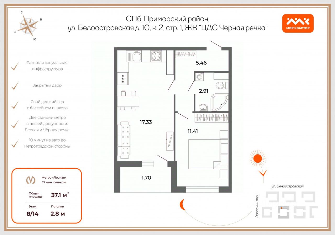 Локация: -две станции метро в пешей доступности (Лесная и Чёрная речка), -до Петроградской стороны 15 минут на автомобиле, -отличная транспортная доступность, легко добраться в центр и другие районы, -набережная Невы, парки и скверы с прогулочными зонами и оборудованными местами отдыха.