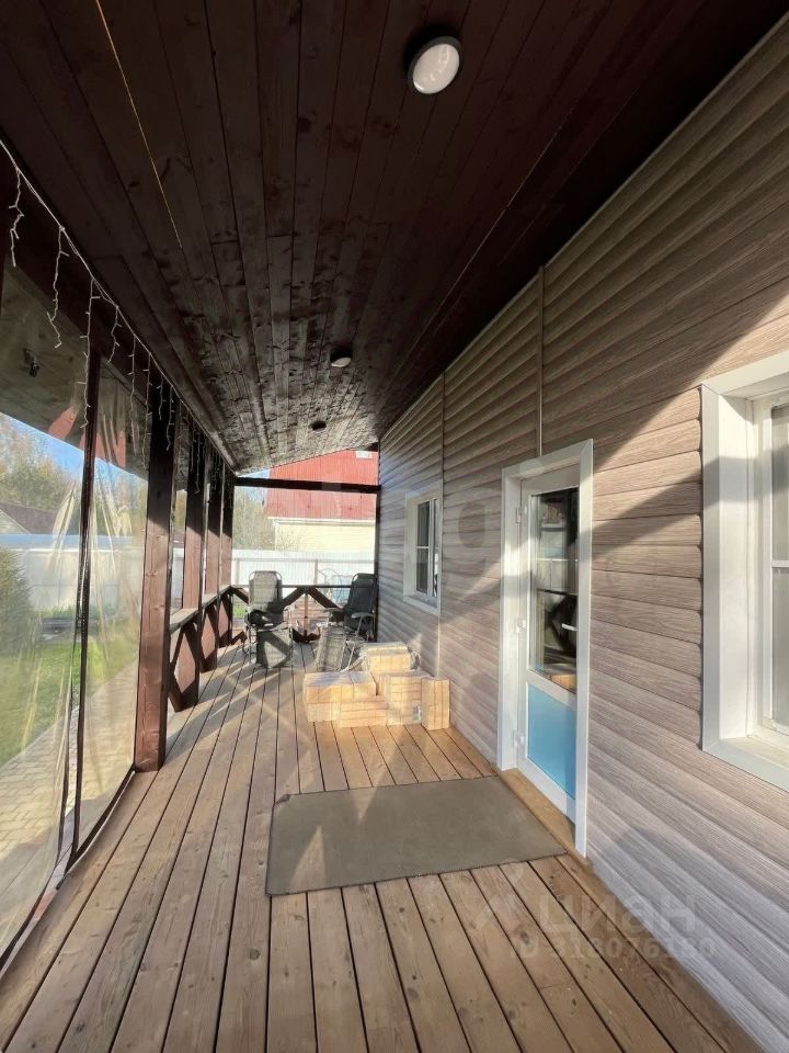 С внутренней стороны участка в доме большая красивая терраса из импрегнированной террасной доски с гибкими окнами, удобно в дождь и снег, легко открываются летом.