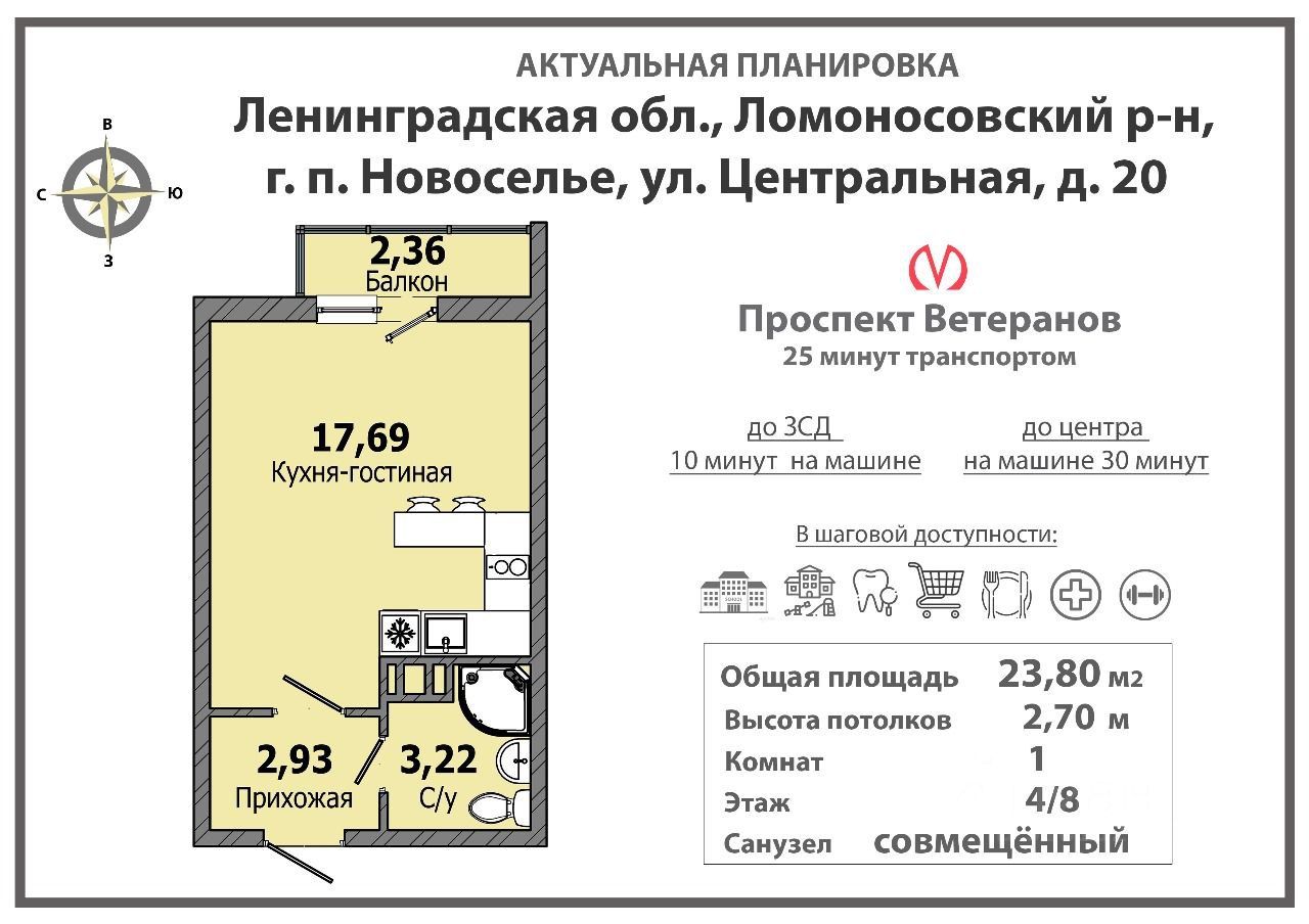 Продается СТУДИЯ 23,8 кв.м. в ЖК НОВОСЕЛЬЕ - новом просторном, чистом районе без высотной застройки. КВАРТИРА: Новая. Не сдавалась. Стильная авторская отделка. Качественные материалы: безопасная и надежная медная эл. проводка, удобное расположение розеток, качественная сантехника FRAP, износостойкий ламинат. Качественные стеклопакеты, дополнительная вентиляция для кухонной вытяжки и санузла. Зональное освещение. Натяжные потолки класса - премиум. Импортная плитка. Высота потолка 2,7 м. Уникальная планировка. Просторная студия квадратной формы. Нет бесполезного пространства. Лоджия со стеклопакетами. Совмещенный санузел - оптимальной площади и правильной формы. Возможность установки стиральной машины не в ущерб Вашему комфорту. Проделана большая качественная работа. Дальше только полет Вашей фантазии. И комфортный, уютный домашний очаг будет радовать Вас каждый день! ДОМ: Современный красивый дом 8 этажей. Студия на 4 этаже. Закрытая территория с видео наблюдением, большая парковка. Детская площадка, зоны для отдыха и игр. ПРЕИМУЩЕСТВА: Вид из окна на Шунгеровский ЗАКАЗНИК. В 5 км на юг на Гореловском озере расположен пляж для отдыха, рядом Аннинское озеро. Коммунальные платежи 3-4 т. р. в месяц. ИНФРАСТРУКТУРА: НОВОСЕЛЬЕ - совсем рядом, на юге Питера, где отсутствует шум и суета. НОВОСЕЛЬЕ - удобная инфраструктура: магазины, школы, детские сады, кафе, рестораны, поликлиники, аптеки, пункты выдачи заказов. Ледовая Арена, фитнес-центр с бассейном, МФЦ. Для иногородних - рядом аэропорт Пулково. ДОСТУПНОСТЬ: До метро Проспект Ветеранов 20 минут на машине. Или на автобусе 181 и 635. До остановки 10 минут пешком. До ЖД станции Сергиево - электрички 7 минут на авто, или 12 минут на автобусе. Далее БЕЗ ПРОБОК - ГАРАНТИРОВАНО! - по расписанию ( через каждые 10 20 минут) до центра СПб Балтийский вокзал и ст. Метро. Балтийская 18 минут на современном составе Ласточка с кондиционером. Отличная транспортная доступность. Выезд на КАД 5 минут. До ЗСД 12 минут. Приглашаем Вас на просмотр. Вы сами убедитесь в перспективах данной локации. Хорошо подходит под проживание или сдачу в аренду. Разумный ТОРГ уместен.