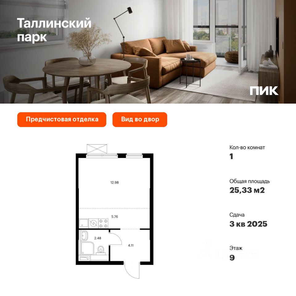 Продаётся квартира-студия площадью 25,33 кв.м на 9 этаже 12 этажного дома (Корпус 3.1, Секция 1) проекта ПИК Таллинский парк. Светлый просторный подъезд на уровне земли, функциональная планировка, большие окна, предчистовая отделка.
