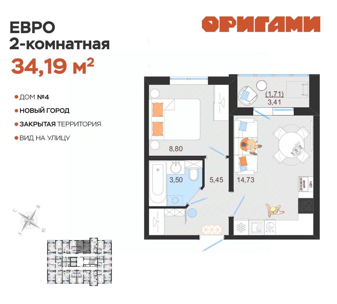 ЖК Оригами Старт продаж дома 4 Комфортная квартира с грамотной планировкой: разумное расположение комнат и просторная кухня гостиная. Сдается в базовой отделке: готова стяжка пола и установлены счетчики, лоджии остеклены и заведен кабель для подключения интернета. Качественные металлические входные двери с надежной фурнитурой. Дополнительно вы можете выбрать любой вид отделки от застройщика — ''whitе bох'' или ''whitе bох PRO'' с полностью готовым санузлом, а также ''под ключ'' в стиле Утро или Вечер. Современные и стильные подъезды с яркими дизайнерскими холлами и качественной отделкой. В каждом подъезде оборудованы просторные колясочные, велосипедные и лапомойки для домашних питомцев. Отдельно вы можете приобрести кладовое помещение на своем этаже для хранения сезонных вещей. Закрытый двор с видеонаблюдением, парковки за пределами двора, грамотное и продуманное зонирование: березовая роща, луг для активностей и пикников площадка для стритбола, столы для тенниса приватные беседки, сухой пляж с шезлонгами, пешеходные дорожки детские площадки с мягким и безопасным покрытием спортивные площадки, воркаут зоны для спорта