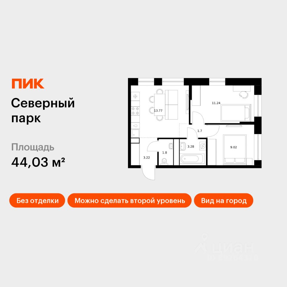 Продаётся 2-комн. квартира площадью 44,03 кв.м на 1 этаже 10 этажного дома (Корпус 10, Секция 1) проекта ПИК Северный парк. Светлый просторный подъезд на уровне земли, функциональная планировка, большие окна, без отделки.