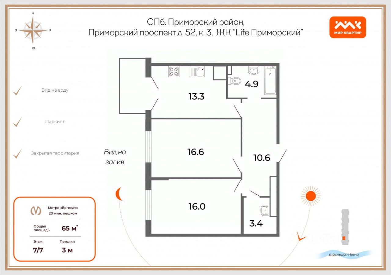 Жилой комплекс LIFE-Приморский - это закрытый квартал бизнес-класса с собственной лесопарковой зоной и благоустроенной набережной. Предлагается к продаже видовая квартира площадью 65 кв.м. Расположена на последнем этаже 7 этажного корпуса и обращена своими окнами на Малую Невку, Вечерние закаты с видом на Газпром арену и Лахту не оставят вас равнодушными.