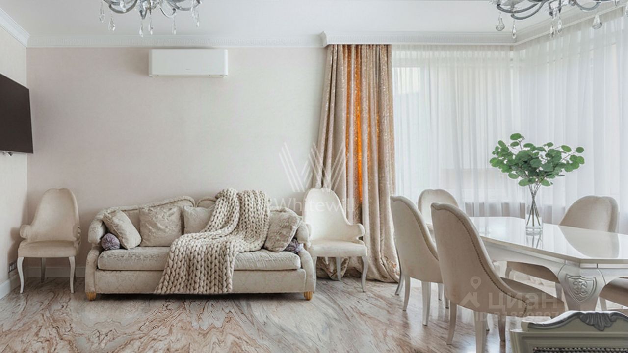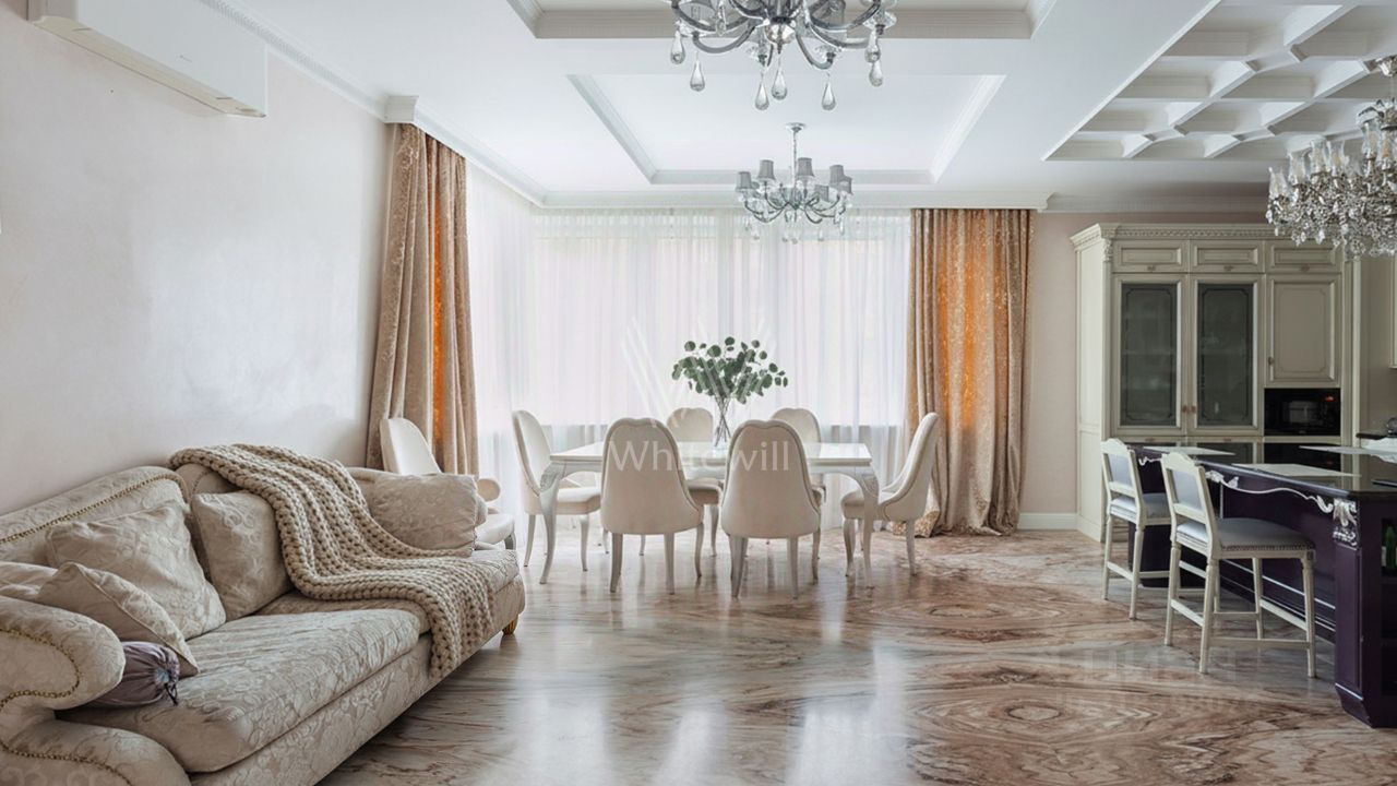 Многоуровневые потолки украшают дизайнерские люстры, стены — декоративные молдинги и графика. Функциональная планировка включает просторную кухню-гостиную с обеденной зоной, мастер-спальню со своей гардеробной, вторую спальню, кабинет, который можно оборудовать как спальню, два санузла и холл.