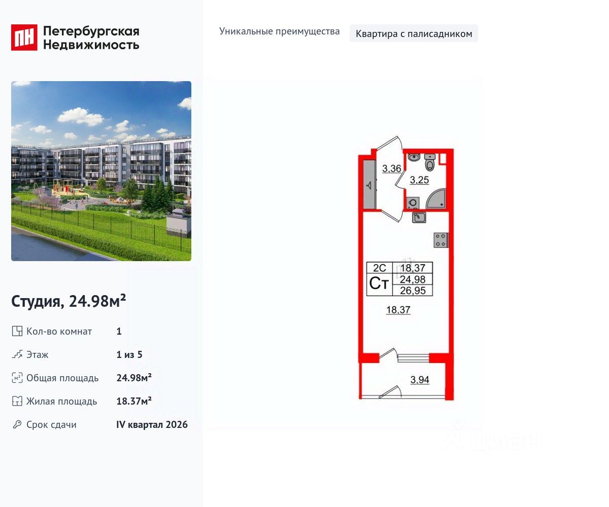 Продается просторная студия от застройщика в жилом комплексе ''Парадный ансамбль'' в престижном Московском районе.