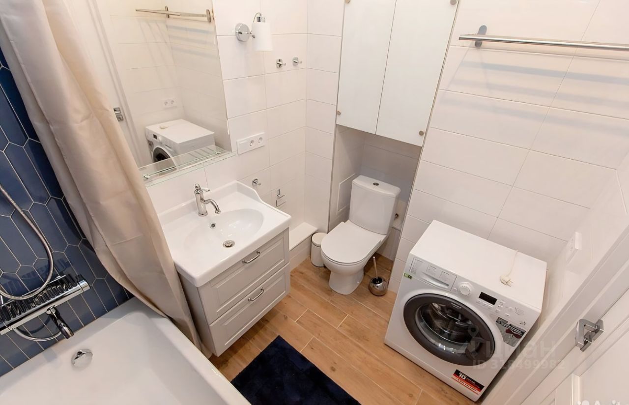 *Ванная комната:* Современная ванная комната ,с раковиной, зеркало и стиральной машиной. Стильный дизайн и удобная планировка создают ощущение свежести и чистоты.