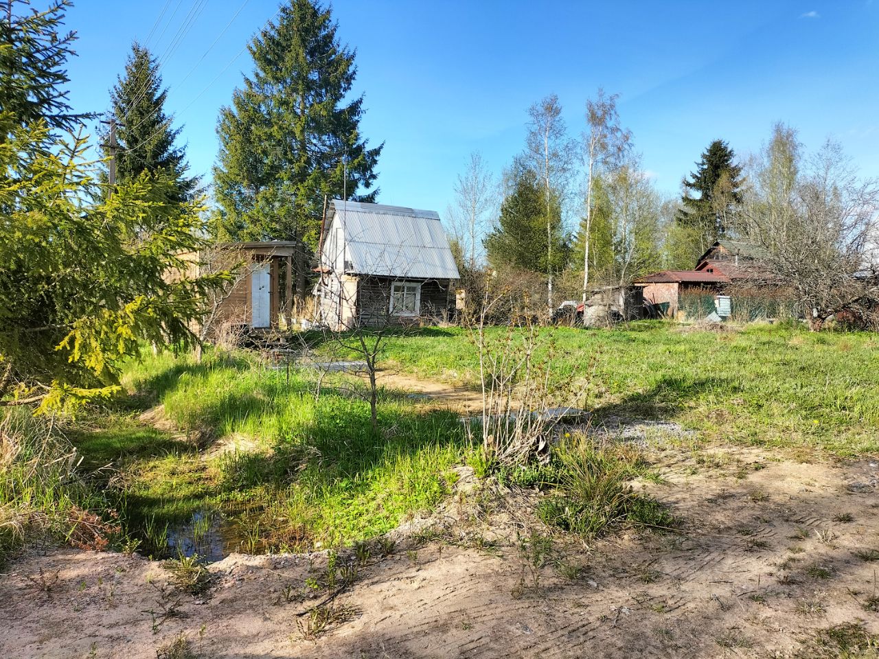 Отличный ровный участок 8 соток с новой баней и колодцем. Участок угловой, по факту пользования почти 10 соток. Есть небольшой старый домик (сейчас используется как склад), колодец и новая полноценная баня 2,5х6 с туалетом (био). Сделан просторный заезд на несколько машин, отсыпана центральная часть под строительство дома, есть трубы под дренаж, проведено электричество, обустроена площадка и установлены бетонные блоки (фундамент) под вагончик-бытовку. Межевание проведено. Хорошее, спокойное садоводство, недалеко лес, метрах в 400 небольшой водоем для купания. До ж/д станции спокойным шагом минут 20-25.