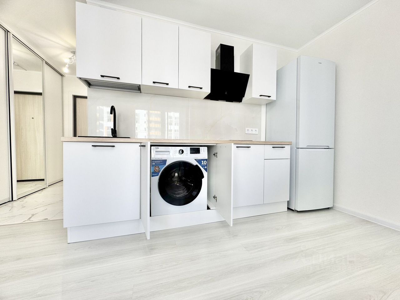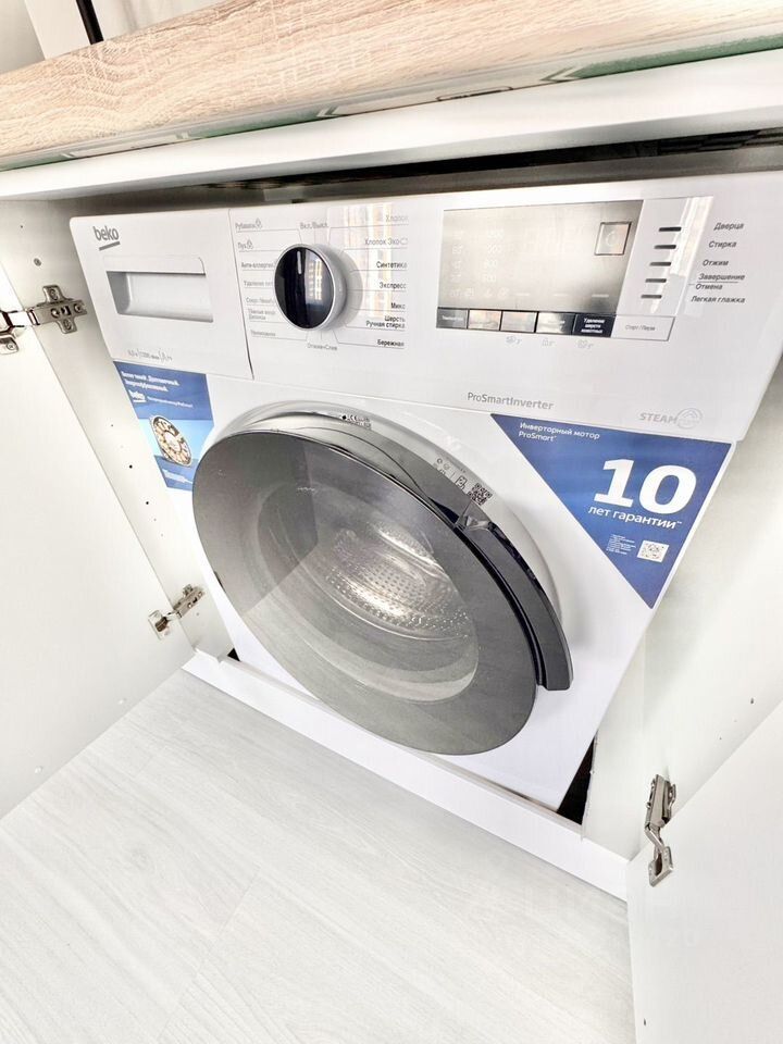 Кухонный гарнитур, варочная поверхность, вытяжке, большой холодильник, стиральная машина,