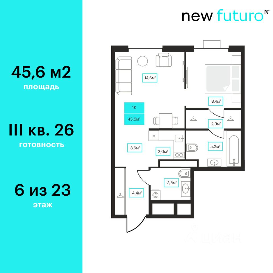 Продаётся 1-комнатная квартира в строящемся доме (Дом 6к1), срок сдачи: III-кв. 2026, общей площадью 45.6 кв.м., на 6 этаже. Новый жилой комплекс ''Futuro'' от застройщика ''newton'' расположен в г. Тюмень на Ставропольской улице.