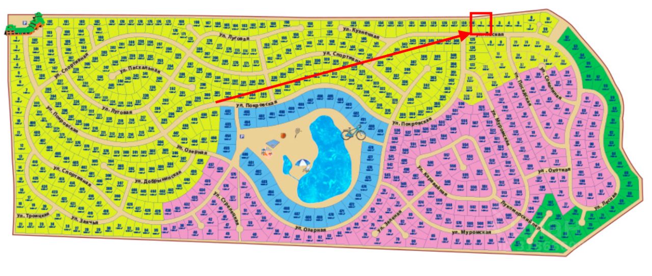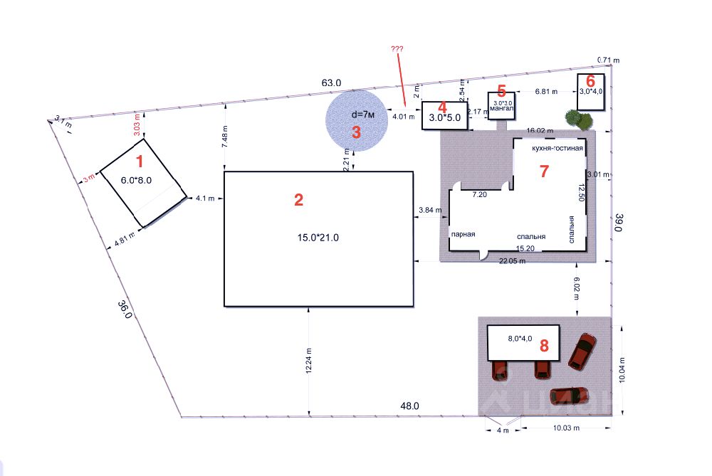 ПЛАН-СХЕМУ как планировали застройку прилагаем в фото объявления, цифры на плане: 1. Гостевой дом 2. Основной дом 3. Костровая зона (лобное место) 4. Беседка 5. Мангальная зона 6. Бассейн 7. Угловая баня 8. Гараж с навесом