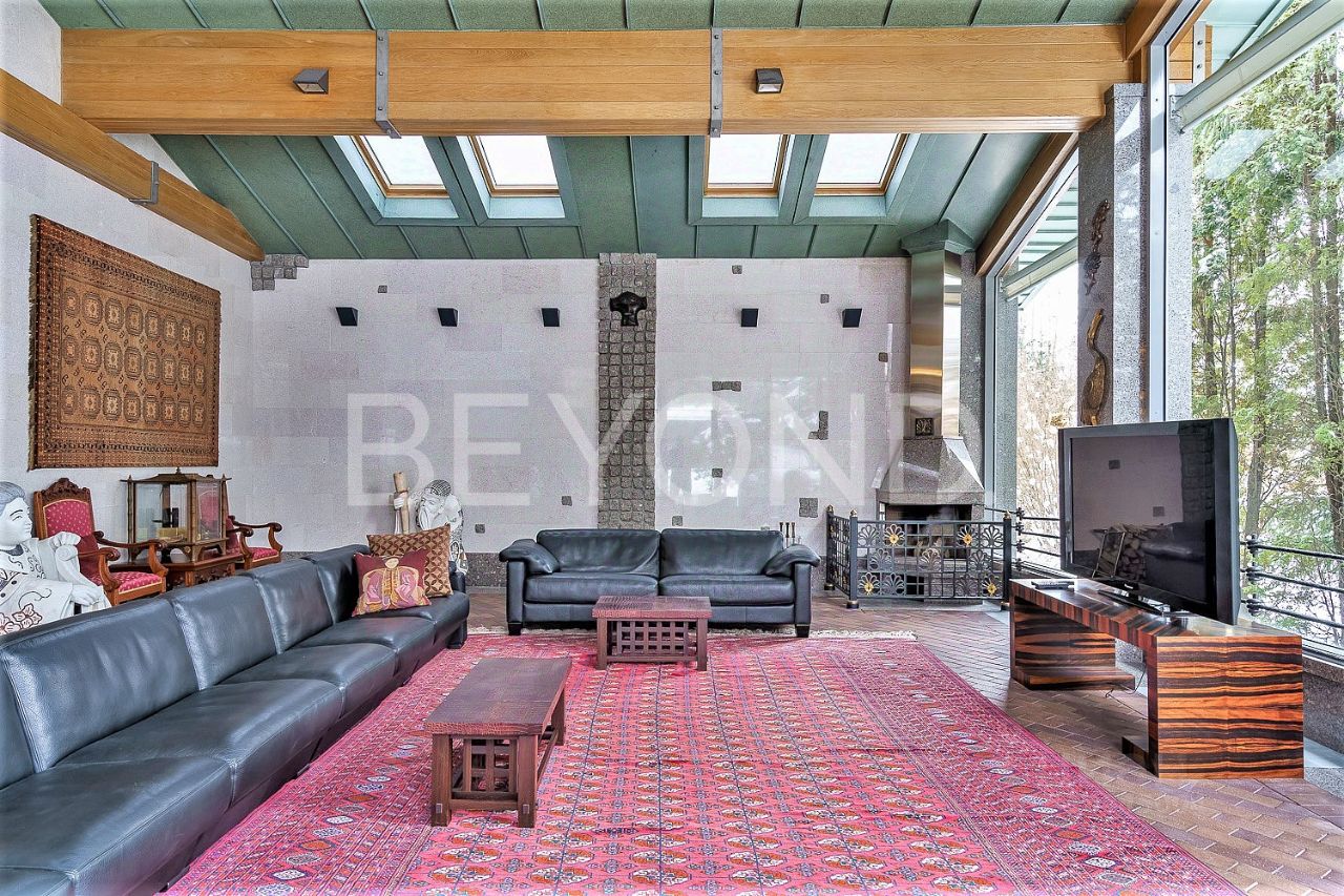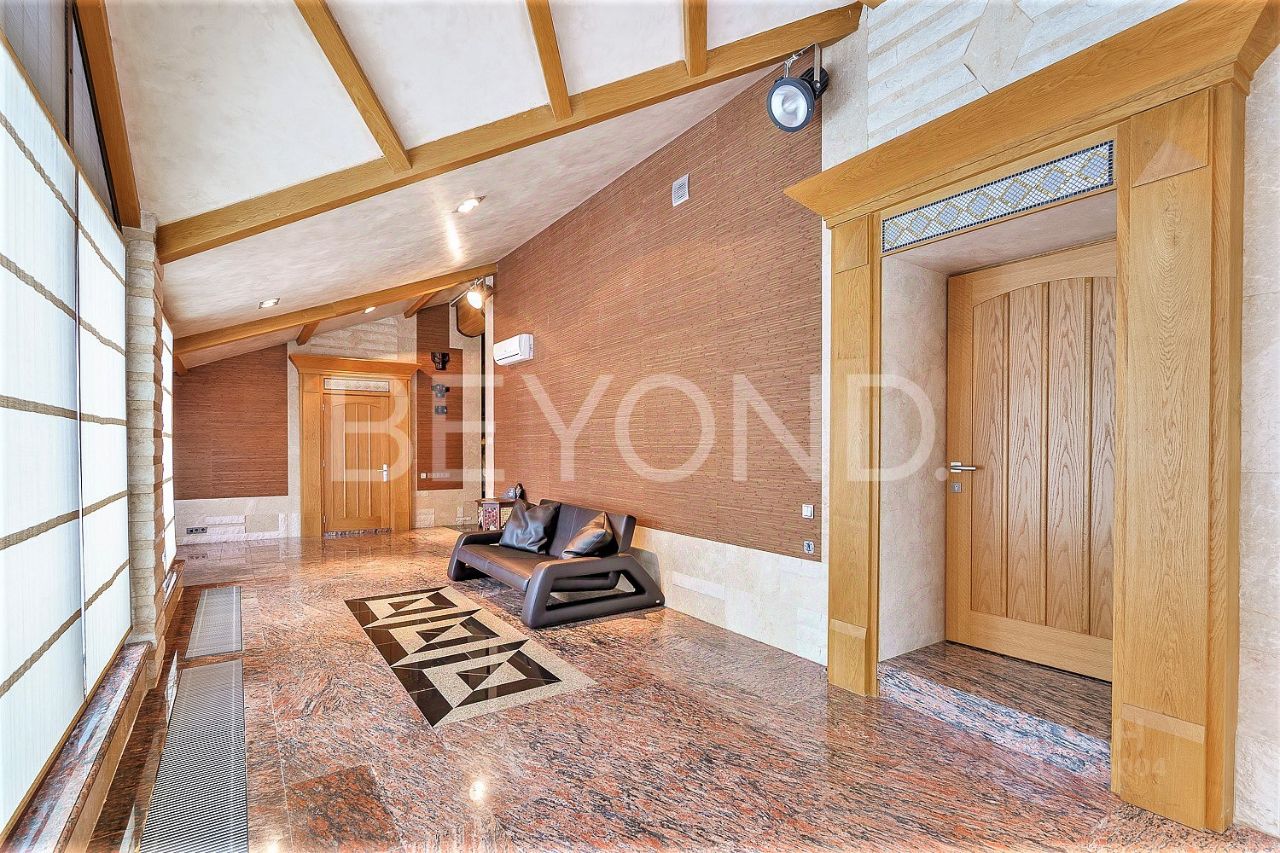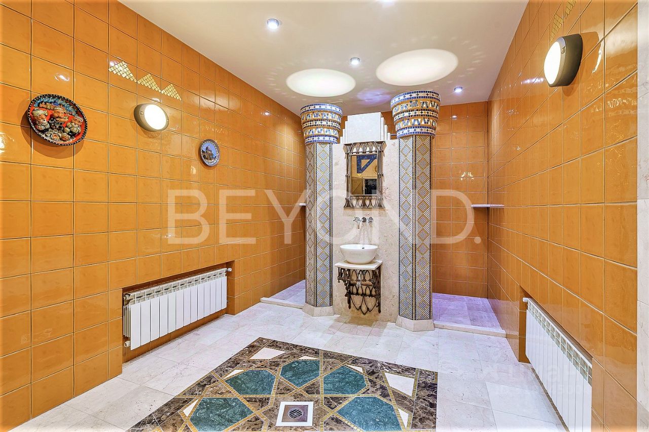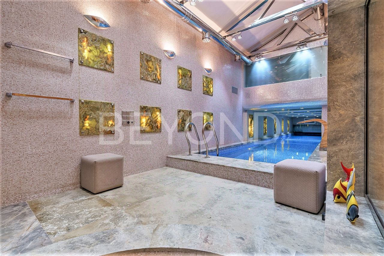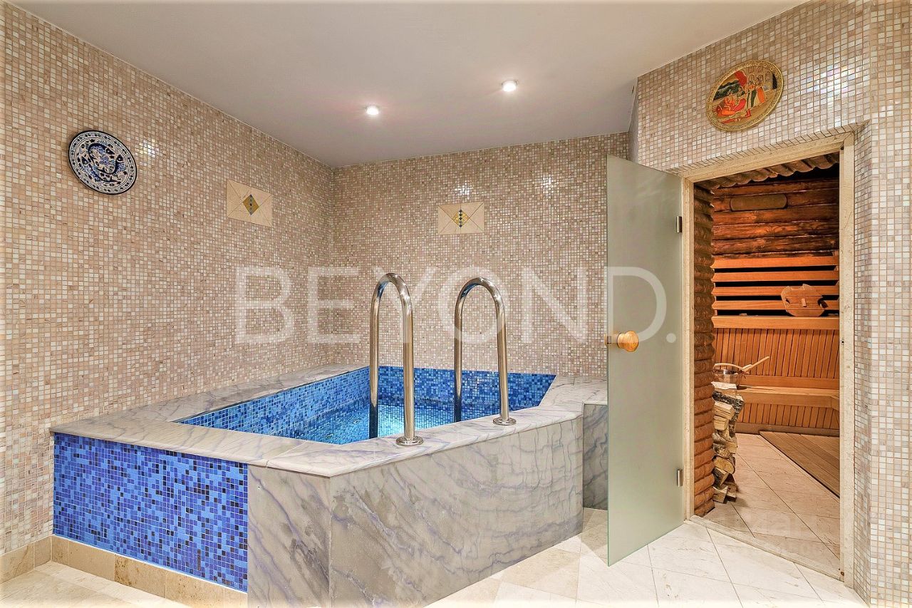 Пространство 1-го этажа основного дома представлено просторной гостиной зоной, кухонной и столовой зоной, обеденным залом, СПА-комплексом с 16-и метровым бассейном, русской и турецкой парной, а также каминным залом, кинотеатром, спальней с собственной ванной комнатой, постирочной и помещением для охраны. На 2-м этаже дома расположились 3 спальни, каждая с собственной ванной комнатой и зона отдыха.