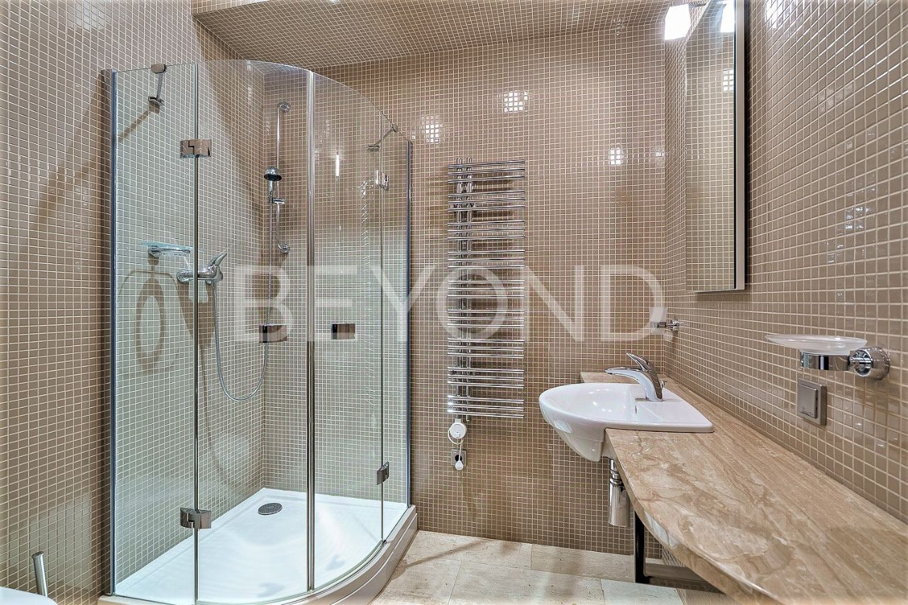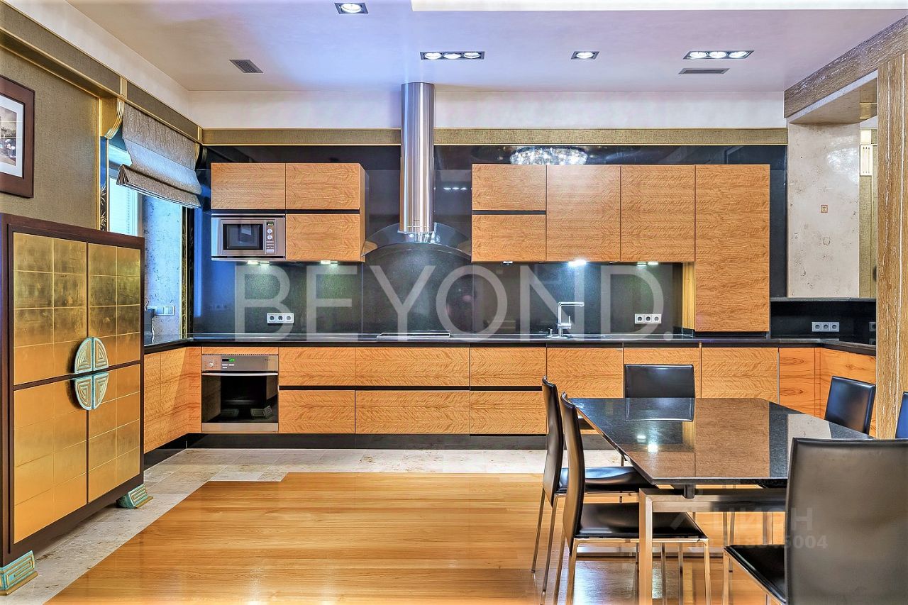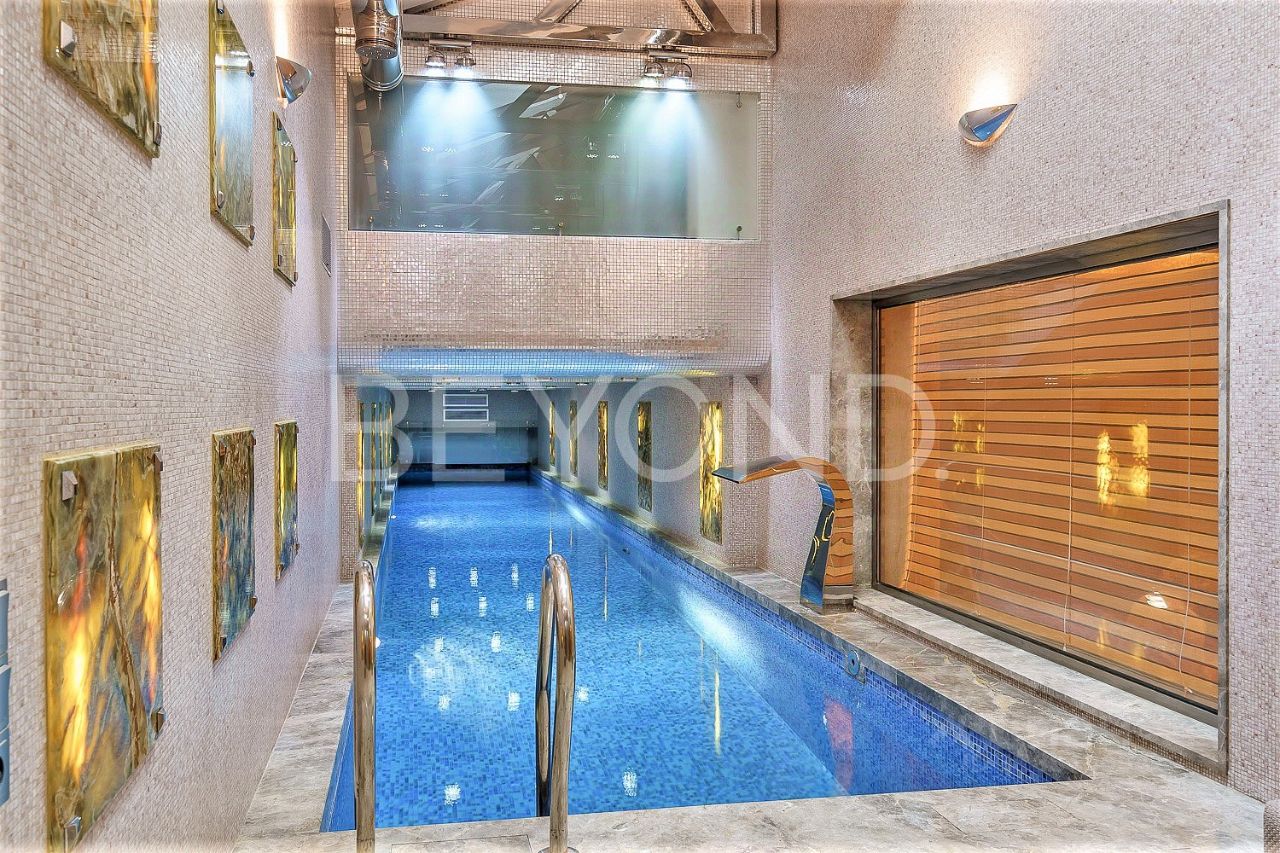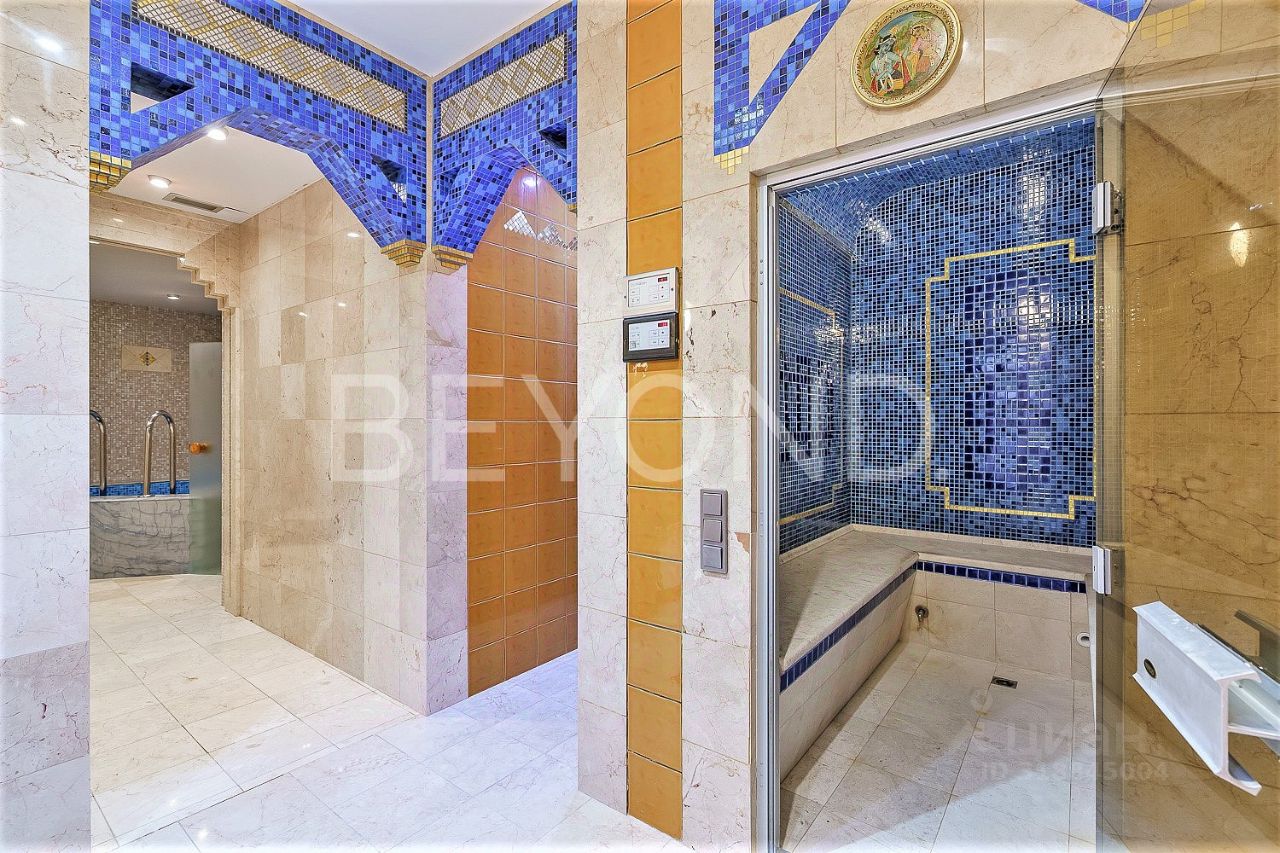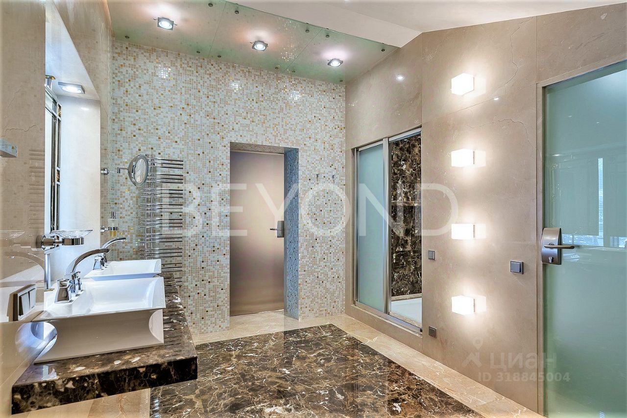 Пространство 1-го этажа основного дома представлено просторной гостиной зоной, кухонной и столовой зоной, обеденным залом, СПА-комплексом с 16-и метровым бассейном, русской и турецкой парной, а также каминным залом, кинотеатром, спальней с собственной ванной комнатой, постирочной и помещением для охраны. На 2-м этаже дома расположились 3 спальни, каждая с собственной ванной комнатой и зона отдыха.