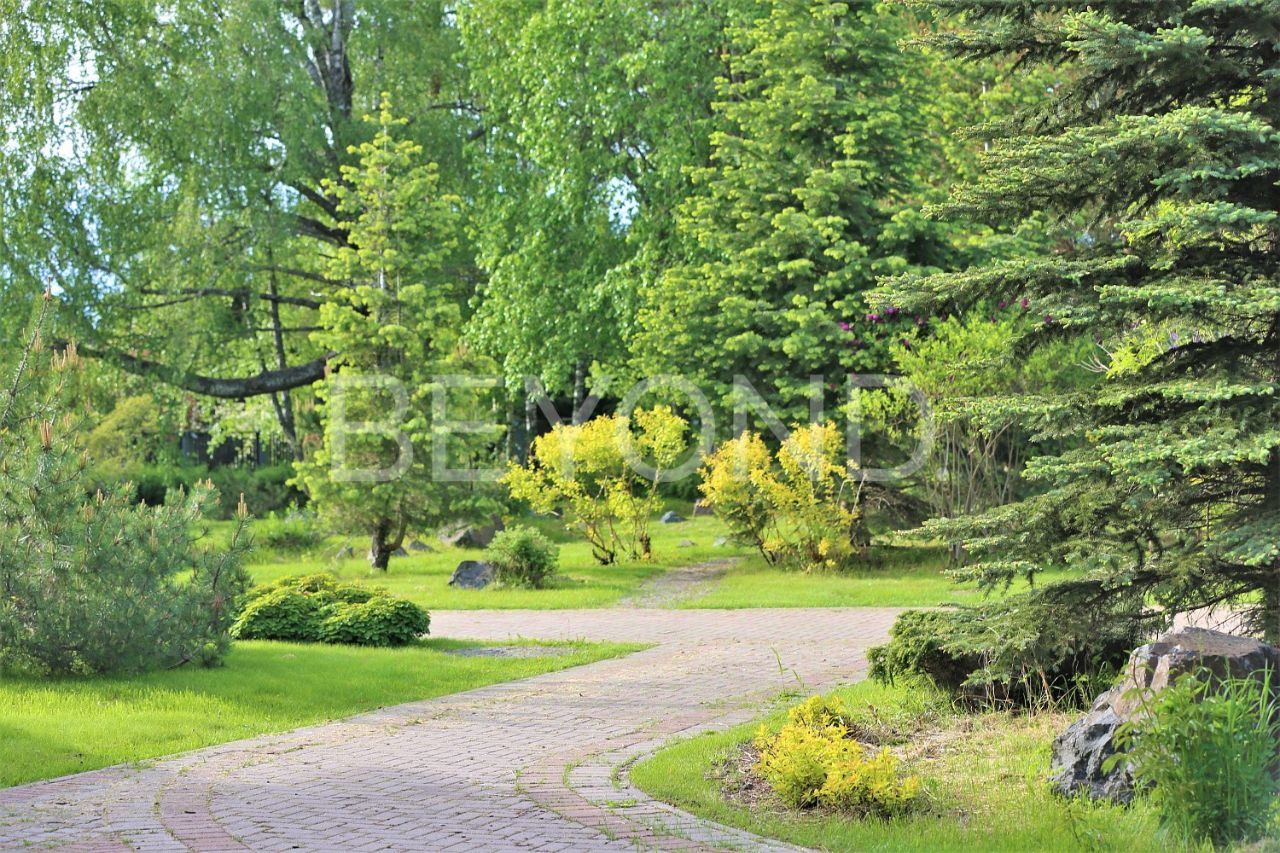 Авторская архитектура строений гармонично вписана в живописный ландшафт участка и образует единый стилистический ансамбль. На участке разбит собственный парк, в котором в изобилии представлены редкие породы хвойных и лиственных деревьев, а также скальные композиции и мраморные скульптуры, дополняющие неповторимый ландшафт участка. Парковая зона, плавно спускаясь к побережью, выходит к собственному пирсу, позволяющему прибыть в усадебный комплекс на яхте.