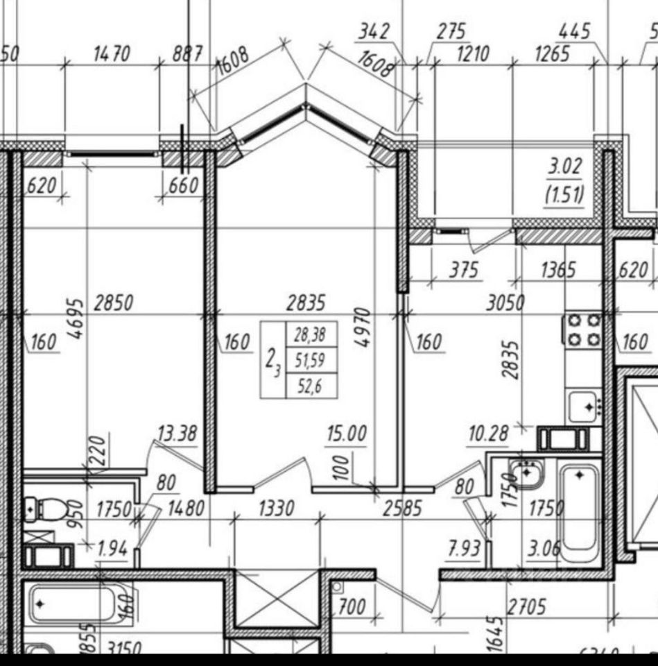 (На фото планировка строительная, после переобмера по ПИБ площадь квартиры составляет 52,5 с коэффициентом балкона).