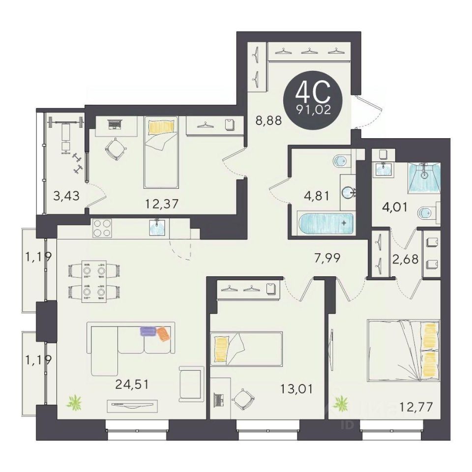 Продаётся 4-комнатная квартира в строящемся доме (Дом 10, 3 этап), срок сдачи: IV-кв. 2027, общей площадью 90.98 кв.м., на 20 этаже. Расположение, транспортная доступностьНовый жилой комплекс комфорт-класса ''Город-парк Ясный Берег'' строится на левом берегу реки Обь, но при этом совсем недалеко от центра Новосибирска. Новый микрорайон расположится рядом с проездом Энергетиков, который переходит в Дмитровский мост. Добраться до самого центра мегаполиса совсем несложно: дорога на автомобиле займет всего десять минут в зависимости от загруженности магистралей (расстояние до исторического центра чуть больше 4 км).На общественном транспорте до центральных районов можно доехать за двадцать пять минут (время в пути зависит и от дорожного трафика, от выбранного маршрута и точного места назначения). В шаговой доступности от ЖК ''Город-парк Ясный Берег'' расположена остановка ''Мост'', откуда курсируют автобусы и маршрутные такси в разные районы Новосибирска.Рядом с новым ЖК проходят крупнейшие транспортные артерии города Октябрьский мост, проезд Энергетиков, улицы Ватутина, Котовского, Станционная и Немировича-Данченко, так что добраться в любую точку города не составит труда как на машине, так и на общественном транспорте.ИнфраструктураЛенинский район, где возводится ''Ясный Берег'', считается престижным, так что уже сейчас новые владельцы квартир города-парка смогут наслаждаться комфортной городской жизнью в тихом микрорайоне. В шаговой доступности: детские садики, общеобразовательные школы, магазины, аптеки, сетевые супермаркеты, кафе, аптеки, медицинские учреждения. За пять минут можно доехать до строительного гипермаркета ''Леруа Мерлен''. Вокруг много мест для отдыха, занятий спортом, прогулок с детьми.Впрочем, согласно концепции, в недалеком будущем жителям ''Города-парка Ясный Берег'' не понадобится часто покидать пределы любимого микрорайона, поскольку новый жилой комплекс будет представлять собой ''город в городе''. На территории ЖК будет большой парк с пешеходными и велосипедными дорожками, местами для отдыха, игровыми зонами. Отличительной особенностью станет детская гоночная трасса точный аналог сочинской ''Формулы-1''.На территории ''Города-парка Ясный Берег'' построят детские площадки с современным игровым оборудованием, школы, развивающие секции и кружки, детские сады (один построен и уже работает). В городе-парке будут и огороженные места для курения, и территории для прогулок с домашними питомцами. В микрорайоне предусмотрено много зон с wi-fi.Надежность застройщикаЗастройщиком проекта является СК ''Аква Сити'', основанная в 2012 году. Генеральным подрядчиком компания ''Метаприбор''. В 2016 году ''Метаприбор'' занял первое место в области по объемам введенного в эксплуатацию жилья (благодаря своевременной сдаче двух корпусов в ЖК ''Город-парк Ясный Берег'').Эти компании осуществляют полный цикл строительства от выбора участков под застройку до внутренней отделки, ввода в эксплуатацию и благоустройству территории новых ЖК.И ''Аква Сити'', и ''Метаприбор'' имеют
