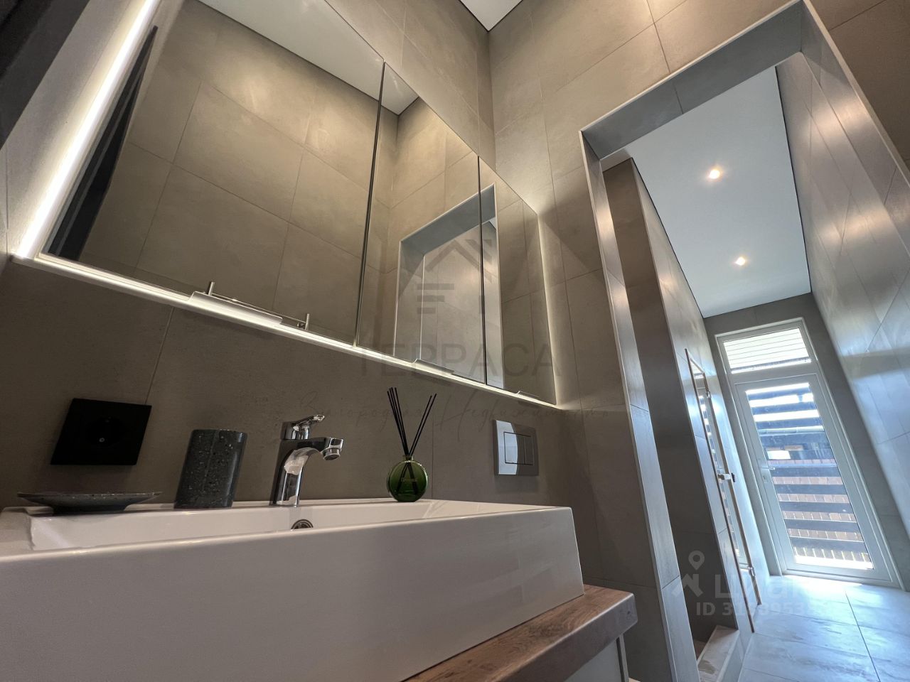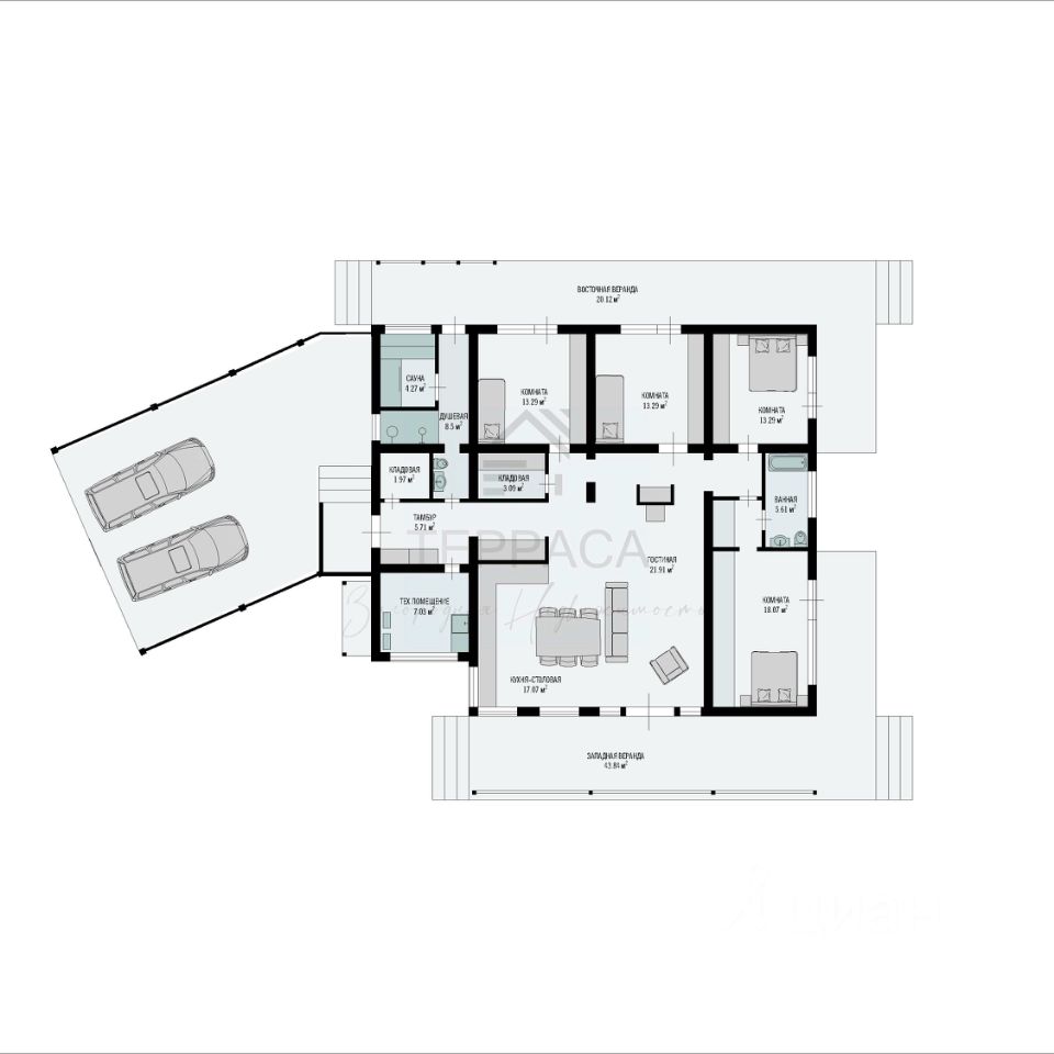 Планировка: Большая крытая Терраса, прихожая с гардеробной и кладовой, коридор, холл, 4 изолированные спальни с панорамными окнами и выходом на террасу (одна из комнат - это мастер-спальня с собственным с\у и гардеробом). Удобная кухня с собственной кладовой и мойкой у окна, полностью оборудована качественной бытовой техникой. Зона столовой у окна и высокий потолок со вторым светом.